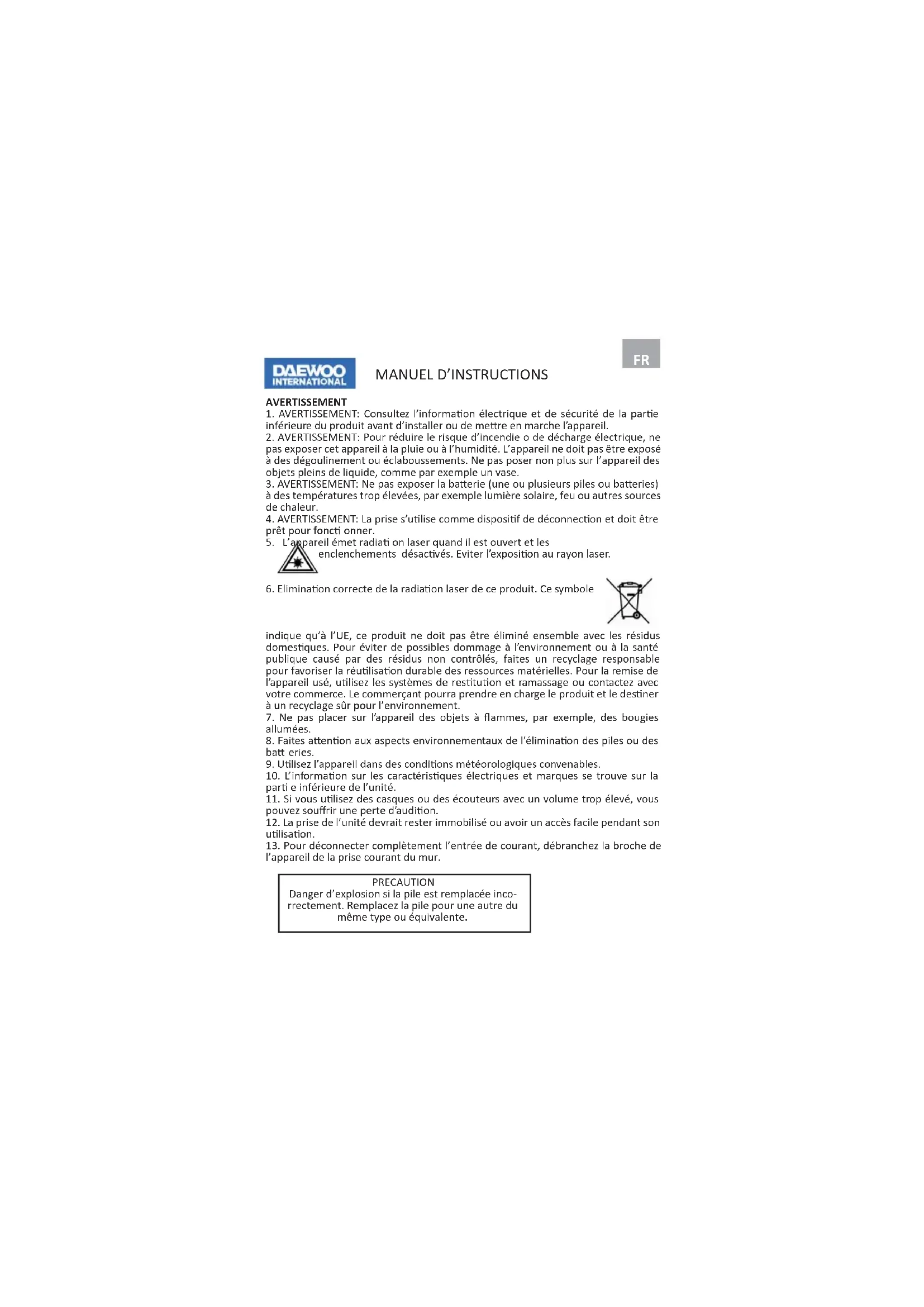 PRECAUTION Danger d’explosion si la pile est remplacée inco- rrectement. Remplacez la pile pour une autre du même type ou équivalente.AVERTISSEMENT POUR EVITER LE RISQUE D’INCENDIE OU DE DÉCHARGE ÉLECTRIQUE, NE PAS EXPOSER CET APPAREIL À LA PLUIE OU À L’HUMIDITÉ. L’é que e suivante, fi xé sur l’unité, énumère le procédé correct pour travailler avec le rayon laser :