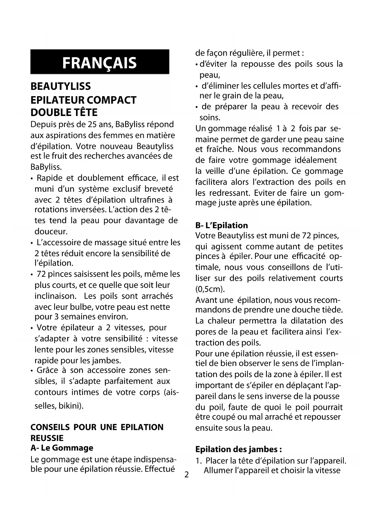 - Utiliser Beautyliss de Babyliss unique- ment pour l’épilation, en respectant les indications de ce mode d’emploi.