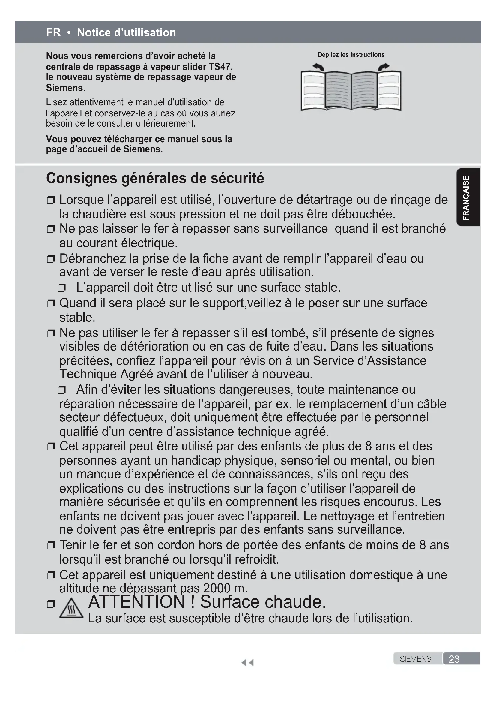the iron will stop steaming at once. If the above does not solve the problem, get in touch with our customer service.23 S I E M E N SFrançaIse Nous vous remercions d’avoir acheté la centrale de repassage à vapeur slider TS47, le nouveau système de repassage vapeur de Siemens. Lisez attentivement le manuel d’utilisation de l’appareil et conservez-le au cas où vous auriez besoin de le consulter ultérieurement. Vous pouvez télécharger ce manuel sous la page d’accueil de Siemens. FR • Notice d’utilisation Dépliez les instructions Consignes générales de sécurité ❐ Lorsque l’appareil est utilisé, l’ouverture de détartrage ou de rinçage de la chaudière est sous pression et ne doit pas être débouchée. ❐ Ne pas laisser le fer à repasser sans surveillance quand il est branché au courant électrique. ❐ Débranchez la prise de la che avant de remplir l’appareil d’eau ou avant de verser le reste d’eau après utilisation. ❐ L’appareil doit être utilisé sur une surface stable. ❐ Quand il sera placé sur le support,veillez à le poser sur une surface stable. ❐ Ne pas utiliser le fer à repasser s’il est tombé, s’il présente de signes visibles de détérioration ou en cas de fuite d’eau. Dans les situations précitées, conez l’appareil pour révision à un Service d’Assistance Technique Agréé avant de l’utiliser à nouveau. ❐ An d’éviter les situations dangereuses, toute maintenance ou réparation nécessaire de l’appareil, par ex. le remplacement d’un câble secteur défectueux, doit uniquement être effectuée par le personnel qualié d’un centre d’assistance technique agréé. ❐ Cet appareil peut être utilisé par des enfants de plus de 8 ans et des personnes ayant un handicap physique, sensoriel ou mental, ou bien un manque d’expérience et de connaissances, s’ils ont reçu des explications ou des instructions sur la façon d’utiliser l’appareil de manière sécurisée et qu’ils en comprennent les risques encourus. Les enfants ne doivent pas jouer avec l’appareil. Le nettoyage et l’entretien ne doivent pas être entrepris par des enfants sans surveillance. ❐ Tenir le fer et son cordon hors de portée des enfants de moins de 8 ans lorsqu’il est branché ou lorsqu’il refroidit. ❐ Cet appareil est uniquement destiné à une utilisation domestique à une altitude ne dépassant pas 2000 m. ❐ ATTENTION ! Surface chaude. La surface est susceptible d’être chaude lors de l’utilisation.24 S I E M E N S FrançaIse