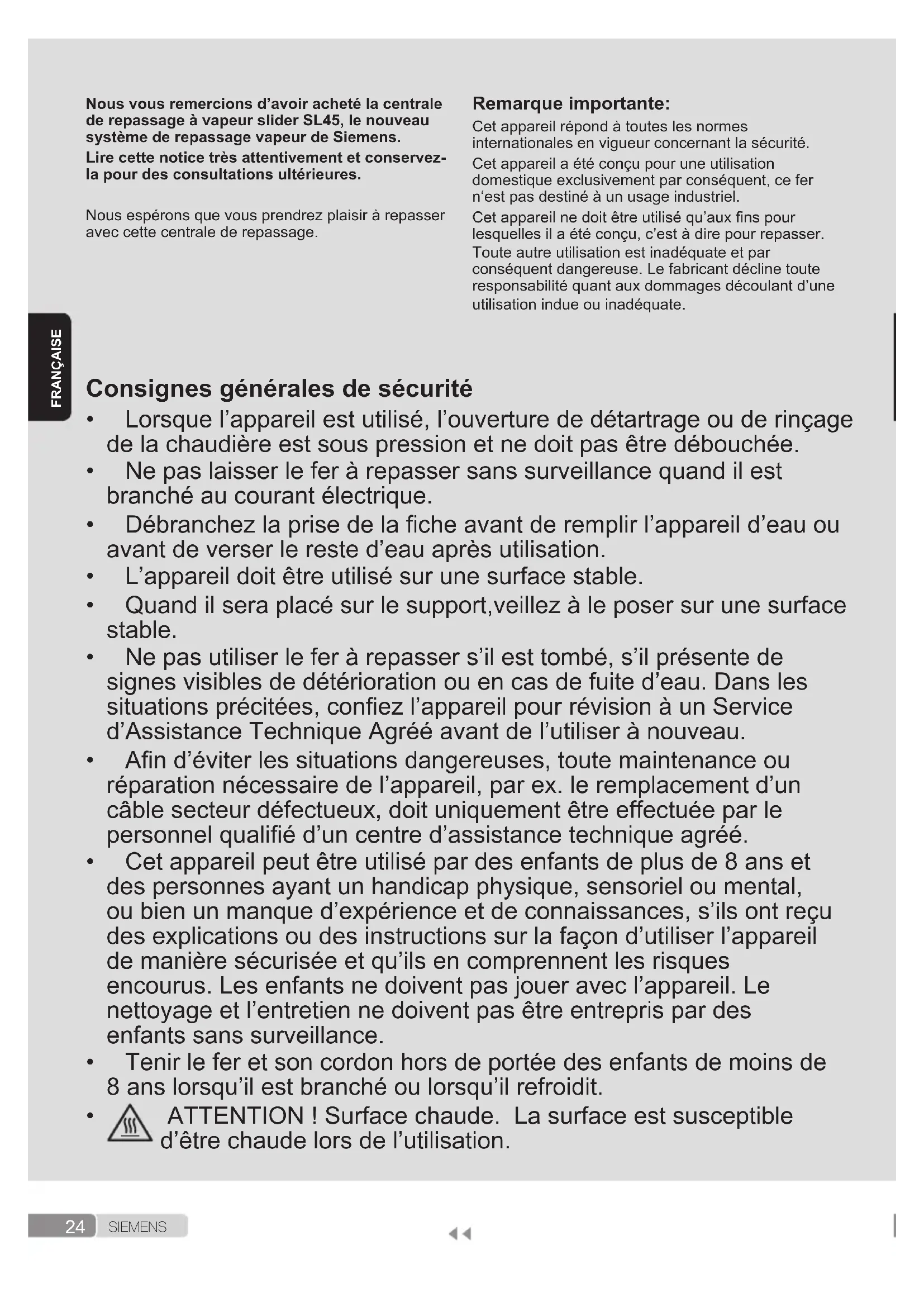 S I E M E N S FRANÇAISE Nous vous remercions d’avoir acheté la centrale de repassage à vapeur slider SL45, le nouveau système de repassage vapeur de Siemens. Lire cette notice très attentivement et conservez- la pour des consultations ultérieures. Nousespéronsquevousprendrezplaisiràrepasser aveccettecentralederepassage. Remarque importante: Cetappareilrépondàtouteslesnormes internationalesenvigueurconcernantlasécurité. Cetappareilaétéconçupouruneutilisation domestiqueexclusivementparconséquent,cefer n‘estpasdestinéàunusageindustriel. Cetappareilnedoitêtreutiliséqu’auxnspour lesquellesilaétéconçu,c’estàdirepourrepasser. Touteautreutilisationestinadéquateetpar conséquentdangereuse.Lefabricantdéclinetoute responsabilitéquantauxdommagesdécoulantd’une utilisationindueouinadéquate. Consignes générales de sécurité