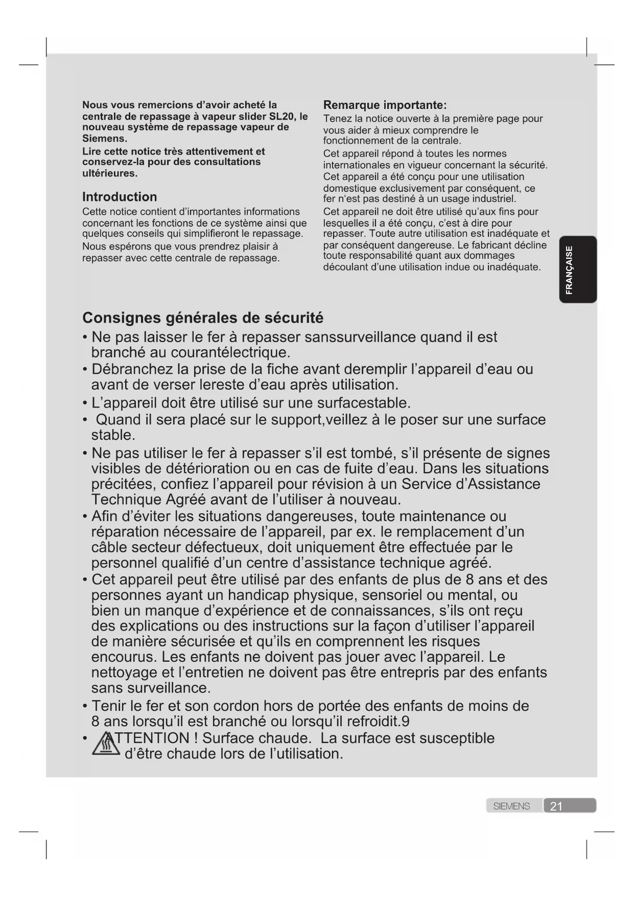 - Just press the trigger once again and the iron will stop steaming at once. If the above does not solve the problem, get in touch with authorized technical service.21 S I E M E N SFRANÇAISE Nousvousremercionsd’avoirachetéla centralederepassageàvapeursliderSL20,le nouveausystèmederepassagevapeurde Siemens. Lirecettenoticetrèsattentivementet conservez-lapourdesconsultations ultérieures. Introduction Cette notice contient d’importantes informations concernant les fonctions de ce système ainsi que quelques conseils qui simplieront le repassage. Nous espérons que vous prendrez plaisir à repasser avec cette centrale de repassage. Remarqueimportante: Tenez la notice ouverte à la première page pour vous aider à mieux comprendre le fonctionnement de la centrale. Cet appareil répond à toutes les normes internationales en vigueur concernant la sécurité. Cet appareil a été conçu pour une utilisation domestique exclusivement par conséquent, ce fer n‘est pas destiné à un usage industriel. Cet appareil ne doit être utilisé qu’aux ns pour lesquelles il a été conçu, c’est à dire pour repasser. Toute autre utilisation est inadéquate et par conséquent dangereuse. Le fabricant décline toute responsabilité quant aux dommages découlant d’une utilisation indue ou inadéquate. Consignesgénéralesdesécurité