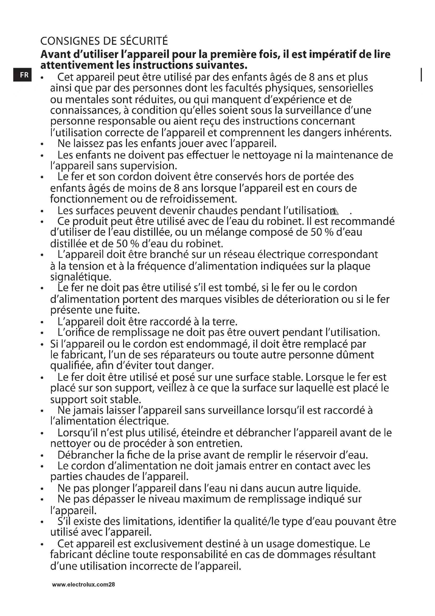 - Cetappareilestexclusivementdestinéàunusagedomestique.Le fabricantdéclinetouteresponsabilitéencasdedommagesrésultant d’une utilisation incorrecte de l’appareil. www.electrolux.com28éLéMENTS A. Semelle B. Indicateur de niveau d’eau maximum C. Goulot de remplissage avec capuchon D. Spray E. Bouton Spray F. Bouton jet de vapeur G. Sélecteurdevapeur/auto-nettoyage H. Voyant d’alimentation