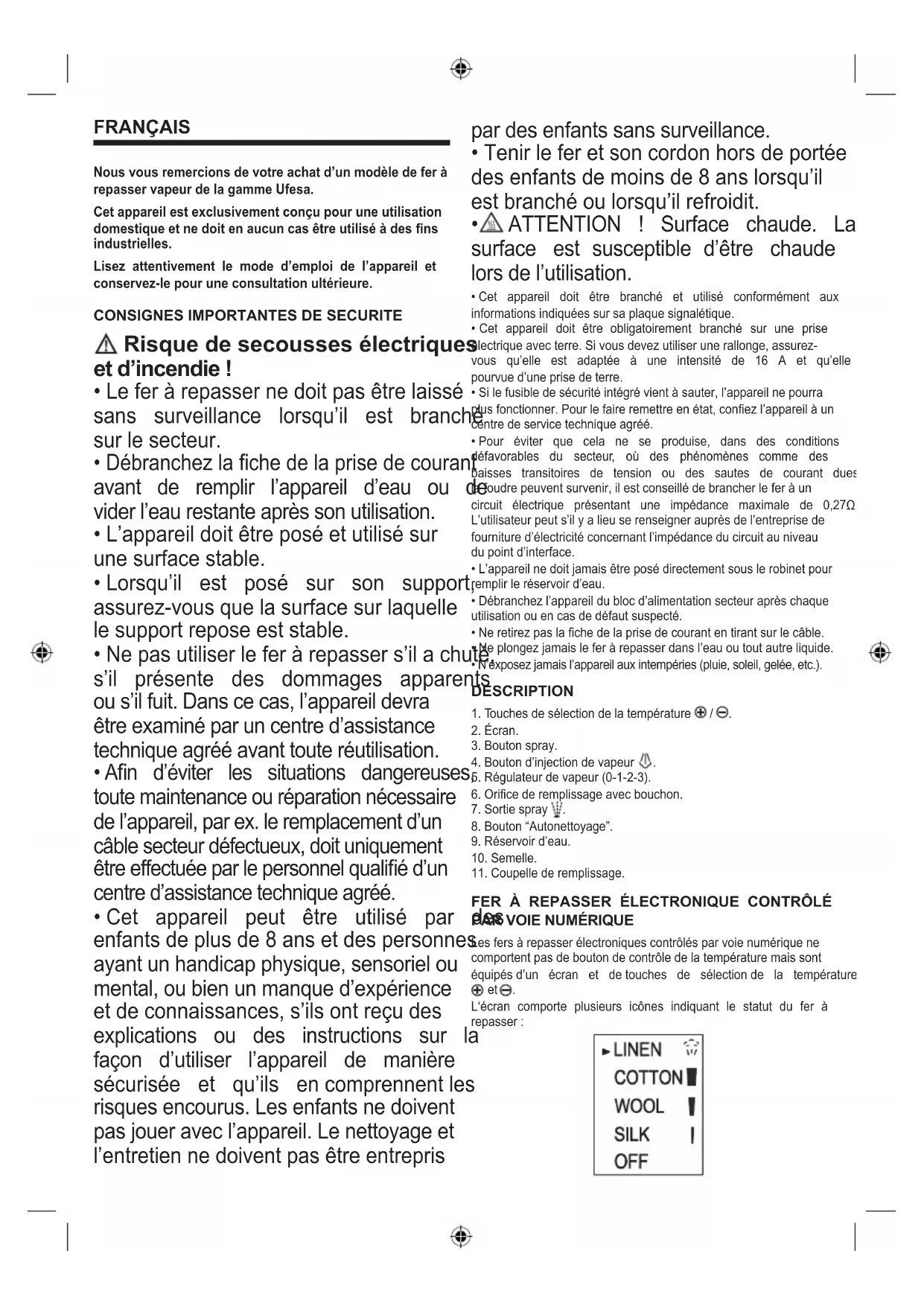 Toutes nos marchandises sont conditionnées dans un emballage optimisé pour le transport. En principe, ces emballagessontcomposésdematériauxnonpolluantsquidevront êtredéposéscommematièrepremièresecondaireauServiceLocal d’éliminationdesdéchets. Produit aux normes de la Directive de l’UE 2002/96/CE. Lelogo“poubelle”apposésurl’appareilindiquequetout appareil électroménager hors d’usage ne doit pas être jetédans les déchetsménagers mais êtredéposé dans uncentre de collecte de déchetsd’appareils électriques ouélectroniquesouqu’ildoitêtreremisàvotrevendeurà l’occasiondel’achatd’unnouvelappareil. Ilincombeàl’utilisateurdedéposerlui-mêmel’appareilhorsd’usage dans un centre de collecte spécialement prévu à cet effet, faute de quoi, celui-ci risque de se voir sanctionné pour manquement aurèglementenvigueurconcernantlesdéchets.Sil’appareilhors d’usageestcorrectementcollectécommedéchettrié,ilpourraêtre recyclé. Traitéetéliminéécologiquementévitantainsitoutimpactnégatifsur l’environnementtoutencontribuantaurecyclagedesmatériauxqui composentleproduit. Pour toutes informations relatives aux Services d’élimination des déchets, adressez-vous à la déchetterie de votre ville ou à votre vendeur habituel. Les fabricants et les importateurs réalisent le recyclage,letraitementetl’éliminationécologique,soitdirectement soitparl’intermédiaired’unsystèmepublic. Pour toute information concernant le dépôt et l’élimination des appareils usagés, renseignez-vous auprès de la Mairie de votre CommuneoudelaPréfecturedevotreDépartement.ANOMALIES LES PLUS COURANTES Problème Cause probable Solution Leferàrepassernechauffe pas. 1.Thermostatréglésurunepositiontrèsbasse. 2.Pasd’alimentationsecteur. 1.Réglezlethermostatsurunepositionplusélevée. 2.Testezavecunautreappareiloubranchezlefer àrepasserdansuneautreprise. Levoyantdel’écranclignote etlaposition“OFF”est sélectionnée. Fonctiond’extinctionautomatiqueactivée. Déplacerleferàrepasserdélicatement. Lesvêtementonttendance àcoller. Températuretrèsélevée. Sélectionnezunetempératurenettementplusbasse. Del’eausortaveclavapeur. 1.Lerégulateurdetemperaturesetrouveen positiontrèsbasse. 2.Régulateurdevapeurréglésurunepositiontrès élevéeavecunetempératurebasse. 1.Sélectionnezlatempératurecorrespondantaux positions“COTTON”et“LINEN”. 2.Réglezlerégulateurdevapeursuruneposition nettementplusbasse(“1”). Aucunevapeurnesort. 1.Lerégulateurdevapeurestenpositionfermée. 2.Lerégulateurdetemperaturesetrouveenposition trèsbasse. 3.Pasd’eaudansleréservoir. 4.Mécanismeobstrué. 1.Sélectionnezlatempératurecorrespondantaux positions“COTTON”et“LINEN”. 2.Réglezlerégulateurdetempératureenposition vapeur(1, 2ou3). 3.Remplissezleréservoir. 4.Retirerl‘aiguilleetlanettoyer.Sicelan‘aaucun effet,contacterleservicetechnique. Lejetd’eaunefonctionnepas. 1.Pasd’eaudansleréservoir. 2.Mécanismeobstrué. 1.Remplissezleréservoir. 2.Contactezleservicetechnique. Del’eausortdelasemelle avantlebranchementdufer àrepasser. Lerégulateurdevapeurn’estpasbienfermé. Veillezàplacerlerégulateurdevapeursurla position« 0 ».N’oubliezpasdeviderleréservoir lorsquevousavezniderepasser. Delafuméesortlorsquele feràrepasserestbranché pourlapremièrefois. Lubricationdesmécanismesinternes. Nevousinquiétezpas.Cecidisparaîtradanspeu detemps,aprèslapremièreutilisation. Ce manuel peut être téléchargé sur le site Web Ufesa.PORTUGUES Agradecemos a compra deste modelo de ferro a vapor Ufesa. Este aparelho foi concebido exclusivamente para o uso doméstico e não deve ser utilizado para ns industriais. Leia atentamente as instruções de utilização do aparelho e conserve-as para futura consulta.