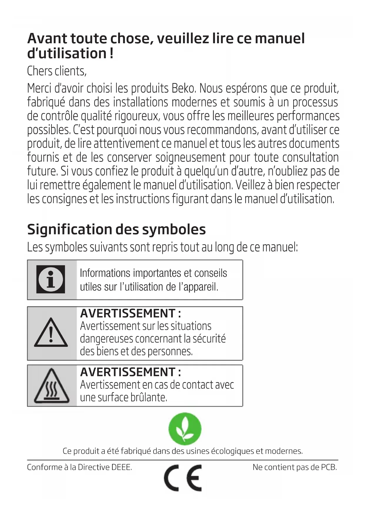 Avertissement en cas de contact avec une surface brûlante. Ne contient pas de PCB.Ce produit a été fabriqué dans des usines écologiques et modernes.Conforme à la Directive DEEE.36 / FR Fer à repasser vapeur / Manuel d'utilisation Cette section contient les consignes de sécu- rité qui aident à se prémunir contre les risques de dommages corporels ou de dégâts maté- riels. Le non-respect de ces consignes annule la garantie.