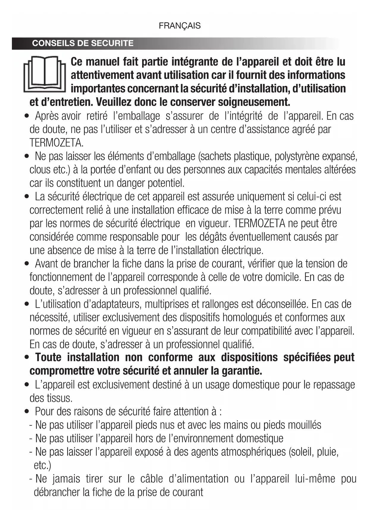 - Après avoir retiré l’emballage s’assurer de l’intégrité de l’appareil. En cas de doute, ne pas l’utiliser et s’adresser à un centre d’assistance agréé par TERMOZETA.