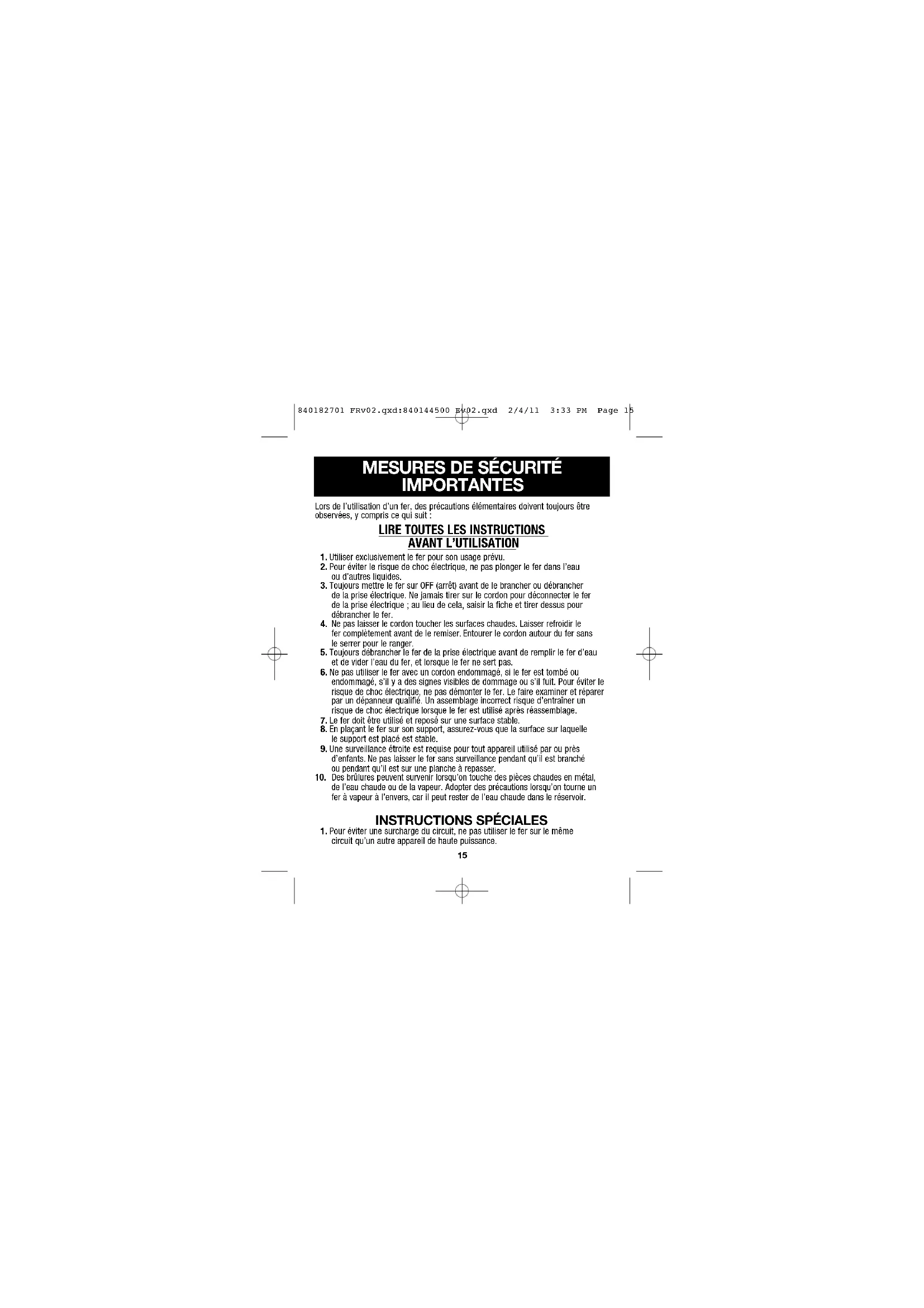 IMPORTANTES Lors de l’utilisation d’un fer, des précautions élémentaires doivent toujours être observées, y compris ce qui suit :