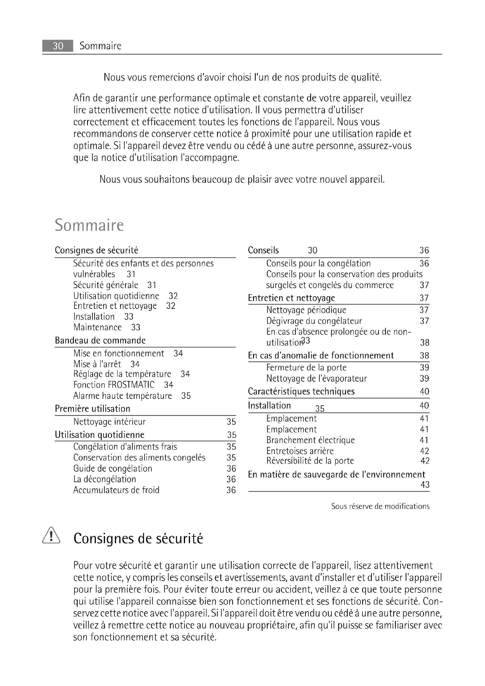 - The door opens and closes correctly. If the ambient temperature is cold (i.e. in Winter), the gasket may not fit perfectly to the cabinet. In that case, wait for the natural fitting of the gasket. Environmental concerns The symbol on the product or on its packaging indicates that this product may not be treated as household waste. Instead it should be taken to the appropriate collection point for the recycling of electrical and electronic equipment. By ensuring this product is disposed of correctly, you will help prevent potential negative consequences for the environment and human health, which could otherwise be caused by inappropriate waste handling of this product. For more detailed information about recycling of this product, please contact your local council, your household waste disposal service or the shop where you purchased the product. Environmental concerns 29Nous vous remercions d’avoir choisi l’un de nos produits de qualité. Afin de garantir une performance optimale et constante de votre appareil, veuillez lire attentivement cette notice d'utilisation. Il vous permettra d’utiliser correctement et efficacement toutes les fonctions de l’appareil. Nous vous recommandons de conserver cette notice à proximité pour une utilisation rapide et optimale. Si l'appareil devez être vendu ou cédé à une autre personne, assurez-vous que la notice d'utilisation l'accompagne. Nous vous souhaitons beaucoup de plaisir avec votre nouvel appareil. Sommaire Consignes de sécurité 30 Sécurité des enfants et des personnes vulnérables 31 Sécurité générale 31 Utilisation quotidienne 32 Entretien et nettoyage 32 Installation 33 Maintenance 33 Bandeau de commande 33 Mise en fonctionnement 34 Mise à l'arrêt 34 Réglage de la température 34 Fonction FROSTMATIC 34 Alarme haute température 35 Première utilisation 35 Nettoyage intérieur 35 Utilisation quotidienne 35 Congélation d'aliments frais 35 Conservation des aliments congelés 35 Guide de congélation 36 La décongélation 36 Accumulateurs de froid 36 Conseils 36 Conseils pour la congélation 36 Conseils pour la conservation des produits surgelés et congelés du commerce 37 Entretien et nettoyage 37 Nettoyage périodique 37 Dégivrage du congélateur 37 En cas d'absence prolongée ou de non- utilisation 38 En cas d'anomalie de fonctionnement 38 Fermeture de la porte 39 Nettoyage de l'évaporateur 39 Caractéristiques techniques 40 Installation 40 Emplacement 41 Emplacement 41 Branchement électrique 41 Entretoises arrière 42 Réversibilité de la porte 42 En matière de sauvegarde de l'environnement