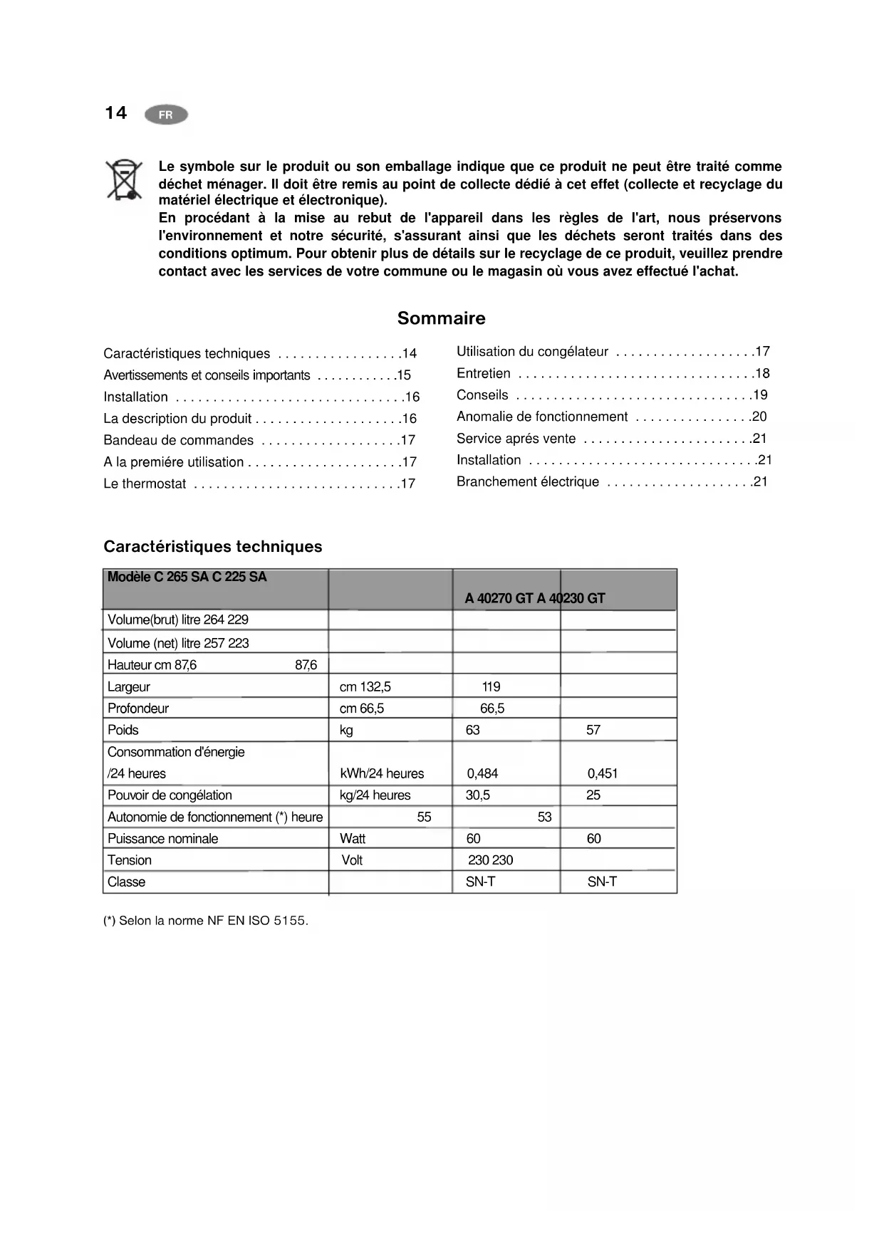 - Branchement électrique Modèle C 265 SA C 225 SA A 40270 GT A 40230 GT Volume(brut) litre 264 229 Volume (net) litre 257 223 Hauteur cm 87,6 87,6 Largeur cm 132,5 119 Profondeur cm 66,5 66,5 Poids kg 63 57 Consommation d'énergie /24 heures kWh/24 heures 0,484 0,451 Pouvoir de congélation kg/24 heures 30,5 25 Autonomie de fonctionnement (*) heure 55 53 Puissance nominale Watt 60 60 Tension Volt 230 230 Classe SN-T SN-T Caractéristiques techniques (*) Selon la norme NF EN ISO 5155.15 p. 21