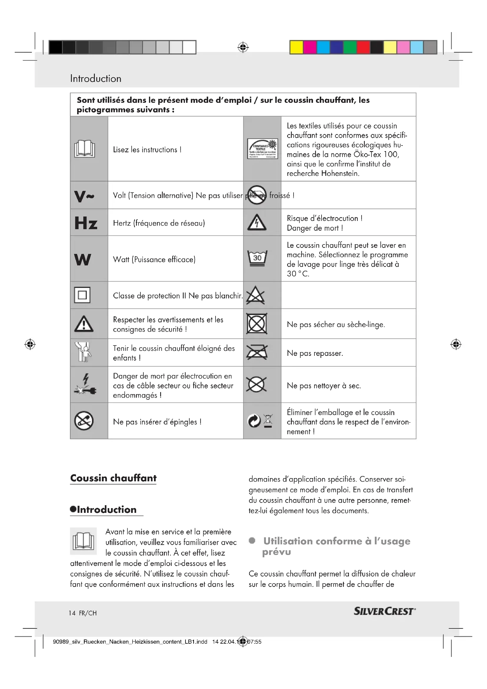 Konformitätserklärung Dieses Heizkissen erfüllt die Anforderungen der geltenden europäischen und nationalen Richtlinien. Dies wird durch CE-Kennzeichnung bestätigt. Entsprechende Erklärungen sind beim Hersteller hinterlegt. 90989_silv_Ruecken_Nacken_Heizkissen_content_LB1.indd 12 22.04.13 07:5513 FR/CH Légende des pictogrammes utilisés .......................................................................... Page 14 Introduction ................................................................................................................................... Page 14 Utilisation conforme à l’usage prévu .................................................................................................Page 15 Description des pièces ........................................................................................................................ Page 15 Contenu de la livraison .......................................................................................................................Page 15 Caractéristiques techniques ................................................................................................................Page 15 Consignes de sécurité importantes ...........................................................................Page 15 Système de sécurité ...............................................................................................................Page 17 Mise en service ...........................................................................................................................Page 17 Activation / désactivation / sélection de la température ................................................................... Page 18 Niveaux de température ....................................................................................................................Page 18 Arrêt automatique ...............................................................................................................................Page 18 Nettoyage et entretien ........................................................................................................ Page 18 Rangement.....................................................................................................................................Page 19 Mise au rebut ............................................................................................................................... Page 19 Garantie / Service .....................................................................................................................Page 19 Déclaration de conformité ................................................................................................ Page 20 Table des matières 90989_silv_Ruecken_Nacken_Heizkissen_content_LB1.indd 13 22.04.13 07:5514 FR/CH Coussin chauffant Introduction Avant la mise en service et la première utilisation, veuillez vous familiariser avec le coussin chauffant. À cet effet, lisez attentivement le mode d’emploi ci-dessous et les consignes de sécurité. N’utilisez le coussin chauf- fant que conformément aux instructions et dans les domaines d’application spécifiés. Conserver soi- gneusement ce mode d’emploi. En cas de transfert du coussin chauffant à une autre personne, remet- tez-lui également tous les documents. Utilisation conforme à l’usage prévu Ce coussin chauffant permet la diffusion de chaleur sur le corps humain. Il permet de chauffer de Sont utilisés dans le présent mode d’emploi / sur le coussin chauffant, les pictogrammes suivants: Lisez les instructions! Les textiles utilisés pour ce coussin chauffant sont conformes aux spécifi- cations rigoureuses écologiques hu- maines de la norme Öko-Tex 100, ainsi que le confirme l’institut de recherche Hohenstein.