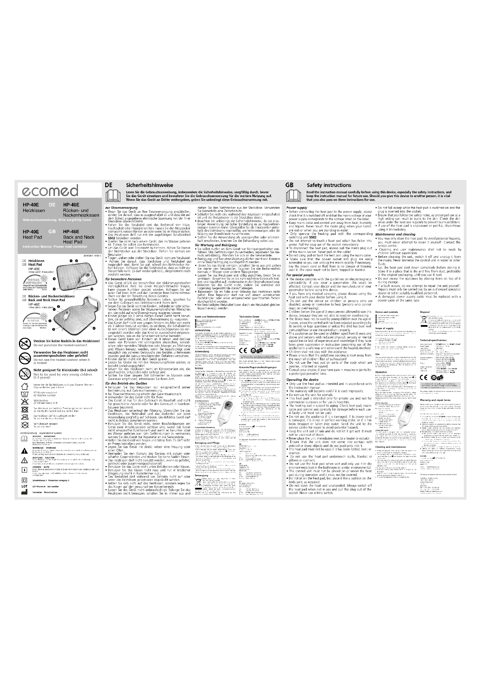 HP46E - Couverture/coussin chauffant Ecomed - Notice d'utilisation et mode d'emploi gratuit