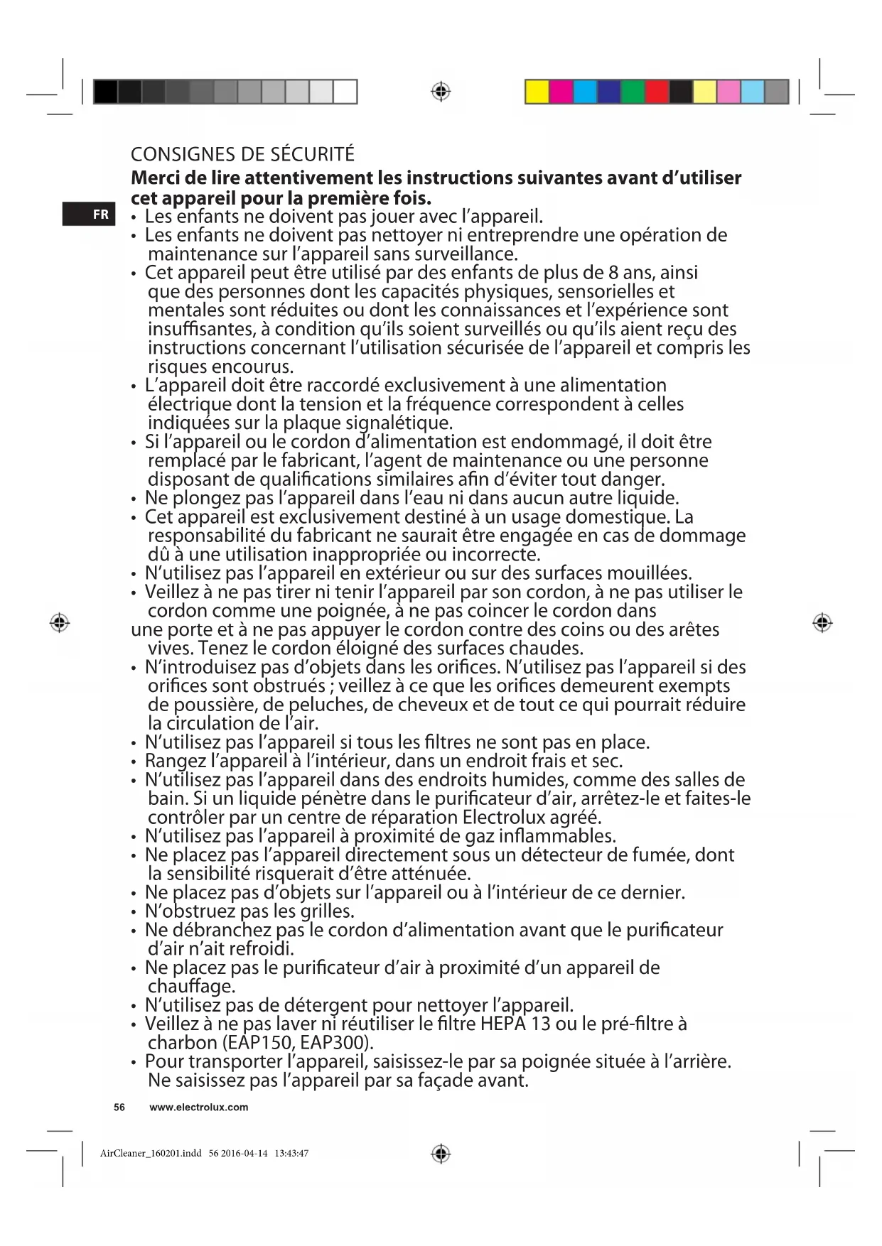EAP150, EAP300, EAP450Problème Causes probables/solution Puis-je nettoyer mon ltre ? Non, les ltres fournis avec l'appareil se désagrègeront et seront inutilisables s'ils absorbent de l'eau. (Les ltres du modèle EAP450 sont lavables.) Puis-je passer l'aspirateur sur mon ltre ? Non, l'aspirateur ne fera que disperser de nouveau la poussière dans l'air. Si vous pensez que le ltre est trop sale, il est peut-être temps de le remplacer. (Vous pouvez nettoyer le pré-ltre lavable du modèle EAP450 avec un aspirateur ou une brosse souple.)Une odeur se dégage de l'appareil, alors que je viens tout juste de l'ouvrir.L'appareil a été enveloppé dans un emballage serré composé de carton ondulé et de plastique. Comme il comporte un ventilateur dans lequel circule de l'air, il est possible que de « nouvelles » odeurs s'en dégagent. En fonction des sensibilités, ces odeurs devraient s'estomper en quelques jours, voire en une semaine, suivant le degré d'utilisation de l'appareil.Cet appareil puriera-t-il une zone plus grande que celle pour laquelle il a été évalué ?Les classications CADR sont déterminées dans un environnement de test contrôlé ; si cet environnement est modié, il se peut que les performances de l'appareil en soient aectées. Cependant, si vous disposez d'une pièce légèrement plus grande que celle de la classication CADR, l'appareil devrait tout de même permettre d'améliorer la qualité de l'air, mais mettra un peu plus de temps à y parvenir. Où dois-je placer l'appareil ? L'air doit circuler correctement sur les côtés et devant l'appareil. La présence de portes ou de couloirs étroits risque de réduire le ux d'air en direction du puricateur d'air, même si une certaine quantité devrait pouvoir circuler à proximité de l'appareil.Le voyant AIR QUALITY est orange ou rouge, mais la qualité de l'air semble satisfaisante.Nettoyez le capteur à l'aide d'un aspirateur, car il est peut-être obstrué ou encrassé.Dans certains cas, l'utilisation d'une bombe d'air comprimé peut permettre d'éliminer la poussière présente dans le capteur.Il reste de la poussière visible dans l'air ou sur mes meubles.L'appareil capture la plupart des poussières et des particules. Cependant, compte tenu de la présence de portes ouvertes, de fenêtres, d'un chauage central, etc. il se peut qu'une certaine quantité de poussière demeure visible.Aucun dispositif ne permet de maintenir les ltres en place.Les ltres sont conçus de manière à rester à l'intérieur de l'appareil. Une fois l'appareil allumé, la force de l'air qui le traverse maintient les ltres fermement en place. J'entends le moteur du ventilateur tourner. Ce bruit est normal, notamment la nuit. Lorsque tout est silencieux, il se peut que vous entendiez le moteur tourner à plusieurs reprises.L'appareil n'élimine plus les odeurs ecacement ou semble dégager une odeur.Vériez que le capteur de qualité de l'air n'est pas obstrué ou encrassé.Rapprochez l'appareil des émanations d'odeurs désagréables.Remplacez les ltres ; il se peut que ces derniers soient en n de vie et ne puissent plus absorber les polluants. Les ltres nécessitent peut-être un remplacement plus fréquent.Le voyant CHECK FILTER reste allumé après le remplacement du ltre HEPA.Appuyez sur le bouton RESET FILTER en insérant délicatement un trombone dans l'orice du bouton RESET FILTER. Laissez le trombone en place pendant 3 à 5 secondes, jusqu'à ce qu'un signal sonore retentisse pour indiquer que l'appareil a été réinitialisé. www.electrolux.com