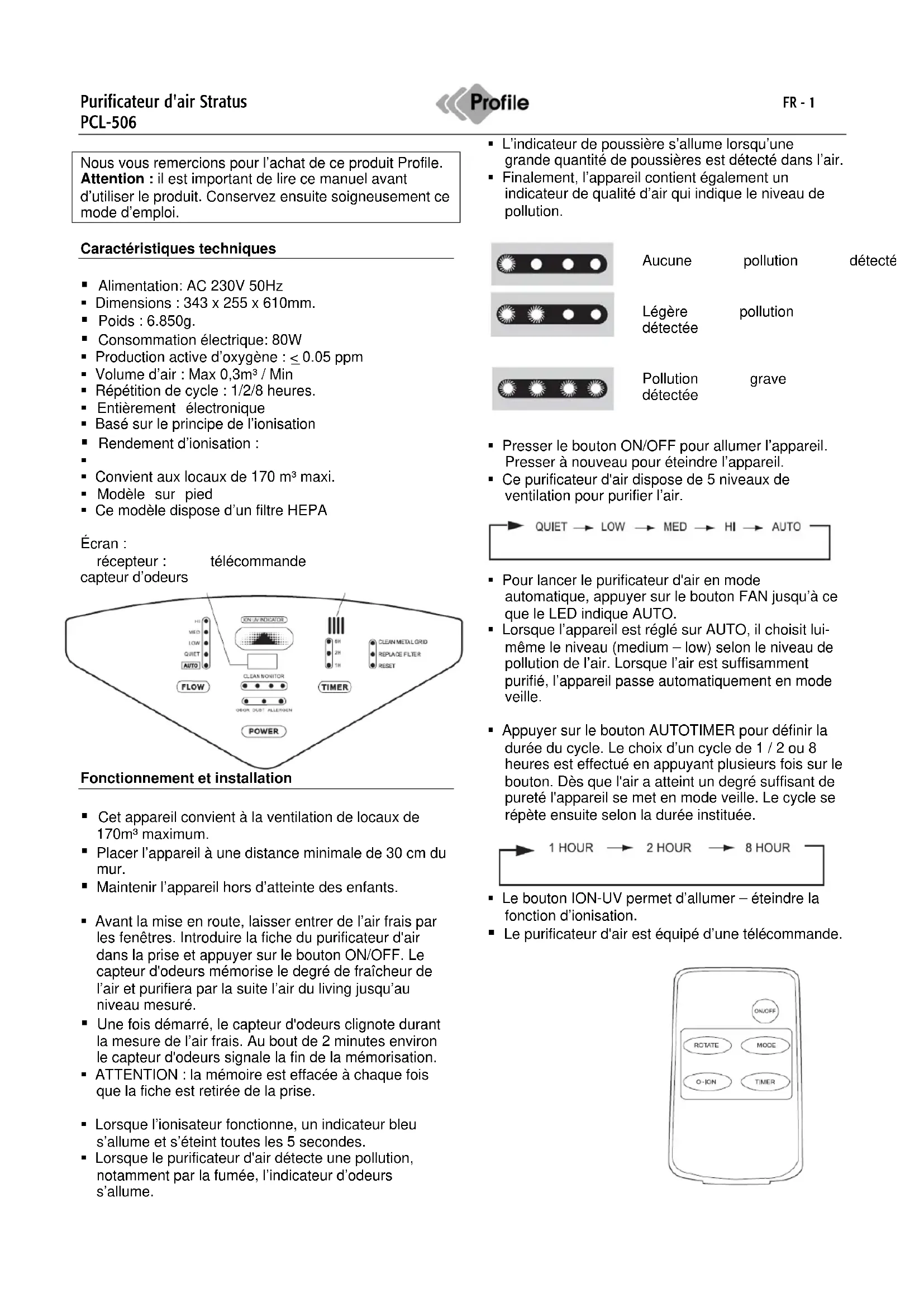 Stratus PCL506 - Purificateur d'air Profile - Notice d'utilisation et mode d'emploi gratuit