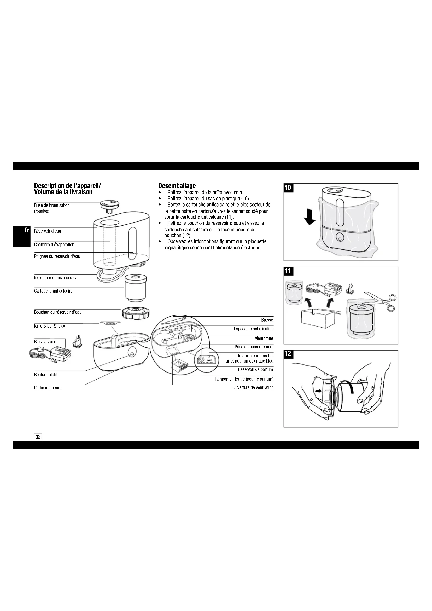 Bloc secteur Buse de brumisation (rotative) Chambred’évaporation Indicateur de niveau d‘eau Poignéeduréservoird‘eau Réservoird’eau Brosse Cartoucheanticalcaire Partieinférieure Bouton rotatif Bouchonduréservoird’eau Membrane Prisederaccordement Tamponenfeutre(pourleparfum) Ouverture de ventilation Désemballage