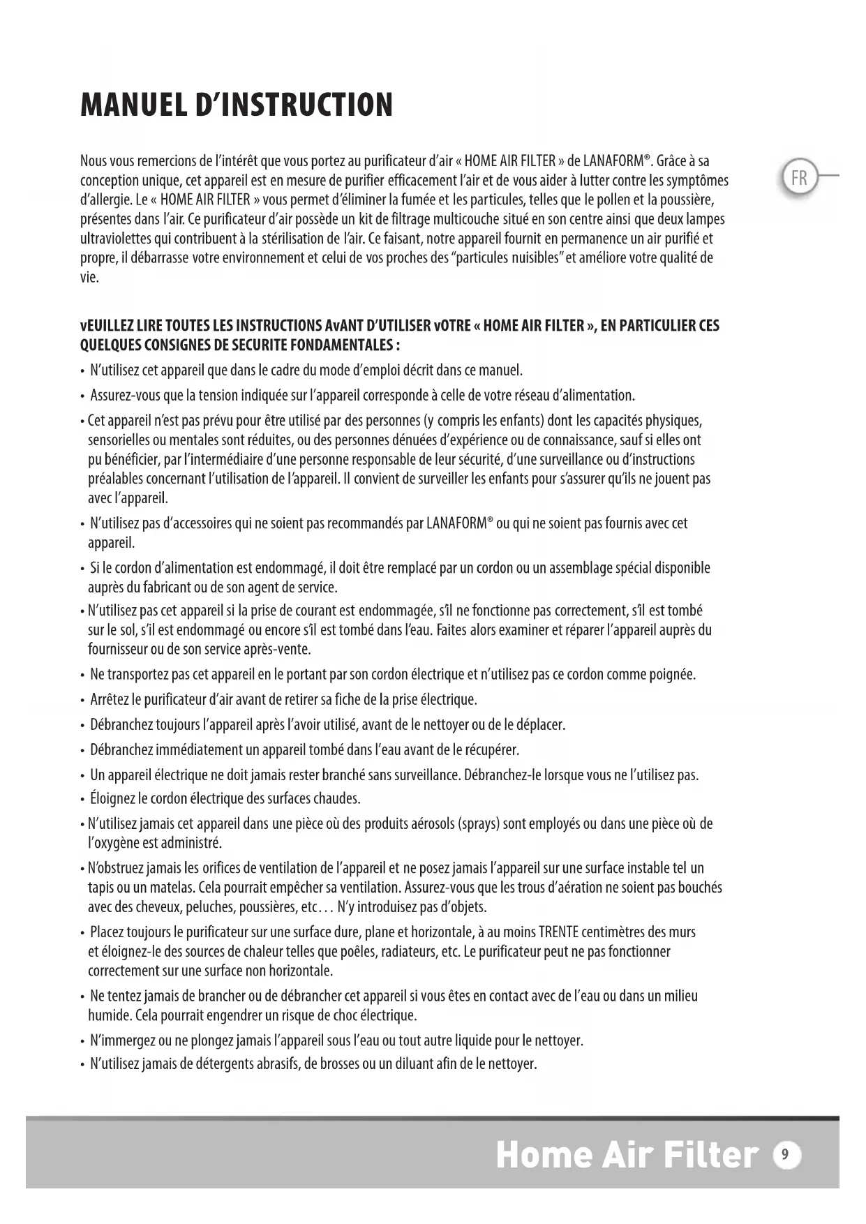 Nous vous remercions de l’intérêt que vous portez au purificateur d’air « HOME AIR FILTER » de LANAFORM®. Grâce à sa conception unique, cet appareil est en mesure de purifier efficacement l’air et de vous aider à lutter contre les symptômes d’allergie. Le « HOME AIR FILTER » vous permet d’éliminer la fumée et les particules, telles que le pollen et la poussière, présentes dans l’air. Ce purificateur d’air possède un kit de filtrage multicouche situé en son centre ainsi que deux lampes ultraviolettes qui contribuent à la stérilisation de l’air. Ce faisant, notre appareil fournit en permanence un air purifié et propre, il débarrasse votre environnement et celui de vos proches des “particules nuisibles” et améliore votre qualité de vie. vEUILLEZ LIRE TOUTES LES INSTRUCTIONS AvANT D’UTILISER vOTRE « HOME AIR FILTER », EN PARTICULIER CES QUELQUES CONSIGNES DE SECURITE FONDAMENTALES :