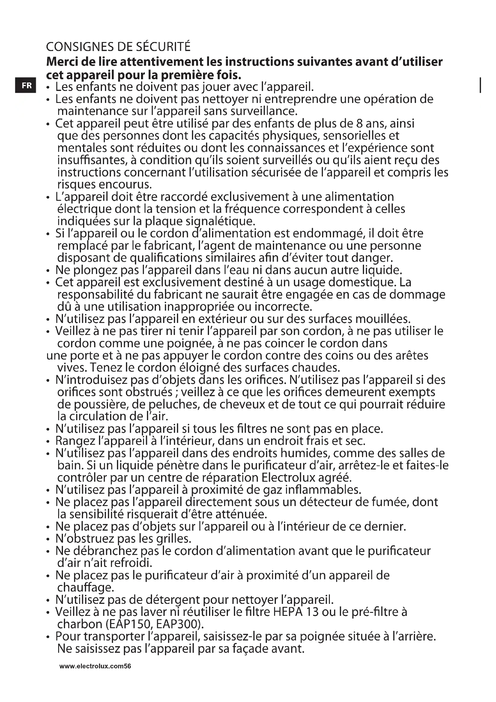 - N’utilisez pas l’appareil dans des endroits humides, comme des salles de bain. Si un liquide pénètre dans le puricateur d’air, arrêtez-le et faites-le contrôler par un centre de réparation Electrolux agréé.