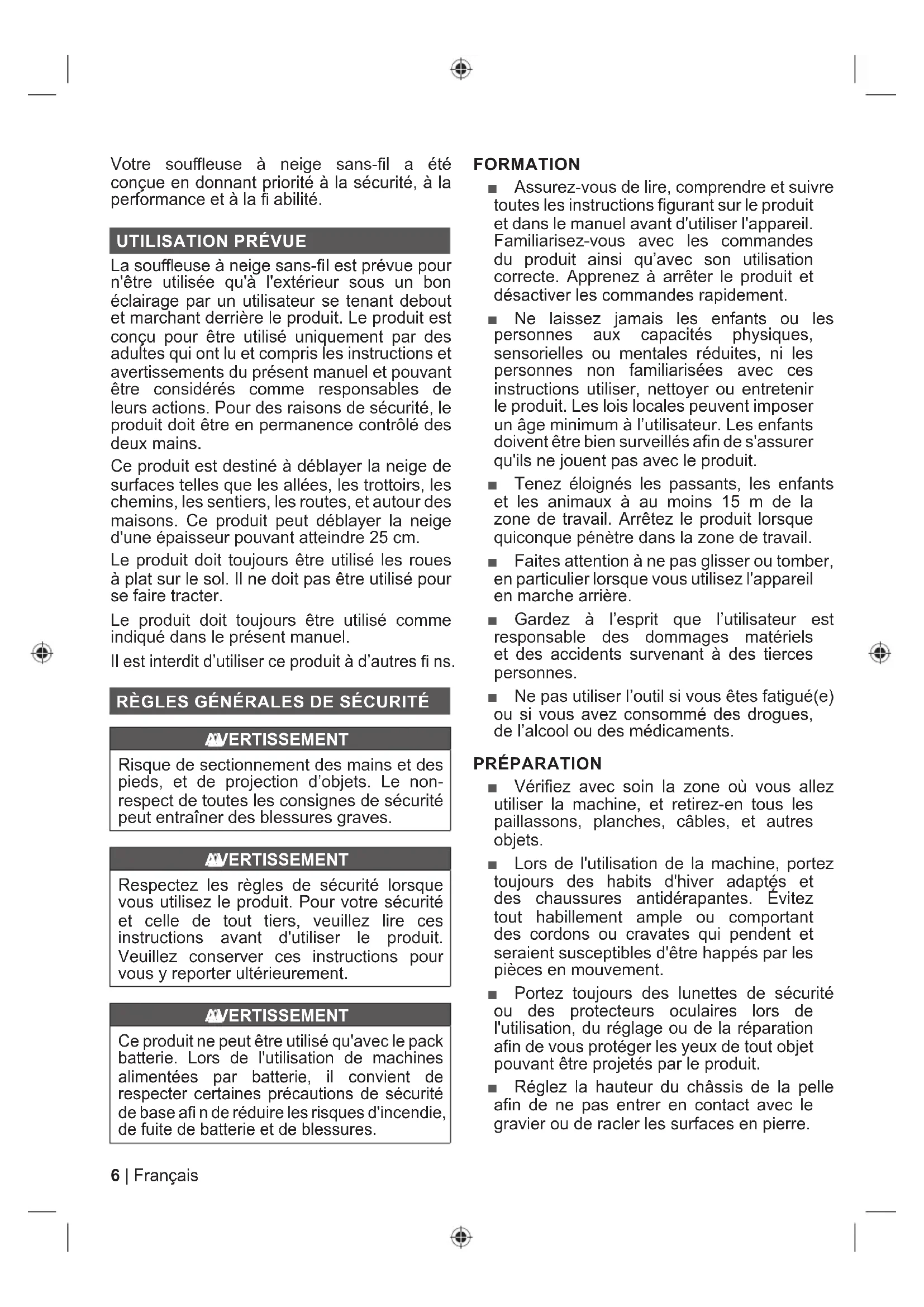La souffl euse à neige sans-fi l est prévue pour n'être utilisée qu'à l'extérieur sous un bon éclairage par un utilisateur se tenant debout et marchant derrière le produit. Le produit est conçu pour être utilisé uniquement par des adultes qui ont lu et compris les instructions et avertissements du présent manuel et pouvant être considérés comme responsables de leurs actions. Pour des raisons de sécurité, le produit doit être en permanence contrôlé des deux mains. Ce produit est destiné à déblayer la neige de surfaces telles que les allées, les trottoirs, les chemins, les sentiers, les routes, et autour des maisons. Ce produit peut déblayer la neige d'une épaisseur pouvant atteindre 25 cm. Le produit doit toujours être utilisé les roues à plat sur le sol. Il ne doit pas être utilisé pour se faire tracter. Le produit doit toujours être utilisé comme indiqué dans le présent manuel. Il est interdit d’utiliser ce produit à d’autres fi ns. RÈGLES GÉNÉRALES DE SÉCURITÉ AVERTISSEMENT Risque de sectionnement des mains et des pieds, et de projection d’objets. Le non- respect de toutes les consignes de sécurité peut entraîner des blessures graves. AVERTISSEMENT Respectez les règles de sécurité lorsque vous utilisez le produit. Pour votre sécurité et celle de tout tiers, veuillez lire ces instructions avant d'utiliser le produit. Veuillez conserver ces instructions pour vous y reporter ultérieurement. AVERTISSEMENT Ce produit ne peut être utilisé qu'avec le pack batterie. Lors de l'utilisation de machines alimentées par batterie, il convient de respecter certaines précautions de sécurité de base afi n de réduire les risques d'incendie, de fuite de batterie et de blessures. FORMATION ■ Assurez-vous de lire, comprendre et suivre toutes les instructions figurant sur le produit et dans le manuel avant d'utiliser l'appareil. Familiarisez-vous avec les commandes du produit ainsi qu’avec son utilisation correcte. Apprenez à arrêter le produit et désactiver les commandes rapidement. ■ Ne laissez jamais les enfants ou les personnes aux capacités physiques, sensorielles ou mentales réduites, ni les personnes non familiarisées avec ces instructions utiliser, nettoyer ou entretenir le produit. Les lois locales peuvent imposer un âge minimum à l’utilisateur. Les enfants doivent être bien surveillés afin de s'assurer qu'ils ne jouent pas avec le produit. ■ Tenez éloignés les passants, les enfants et les animaux à au moins 15 m de la zone de travail. Arrêtez le produit lorsque quiconque pénètre dans la zone de travail. ■ Faites attention à ne pas glisser ou tomber, en particulier lorsque vous utilisez l'appareil en marche arrière. ■ Gardez à l’esprit que l’utilisateur est responsable des dommages matériels et des accidents survenant à des tierces personnes. ■ Ne pas utiliser l’outil si vous êtes fatigué(e) ou si vous avez consommé des drogues, de l’alcool ou des médicaments. PRÉPARATION ■ Vérifiez avec soin la zone où vous allez utiliser la machine, et retirez-en tous les paillassons, planches, câbles, et autres objets. ■ Lors de l'utilisation de la machine, portez toujours des habits d'hiver adaptés et des chaussures antidérapantes. Évitez tout habillement ample ou comportant des cordons ou cravates qui pendent et seraient susceptibles d'être happés par les pièces en mouvement. ■ Portez toujours des lunettes de sécurité ou des protecteurs oculaires lors de l'utilisation, du réglage ou de la réparation afin de vous protéger les yeux de tout objet pouvant être projetés par le produit. ■ Réglez la hauteur du châssis de la pelle afin de ne pas entrer en contact avec le gravier ou de racler les surfaces en pierre.7 Français |