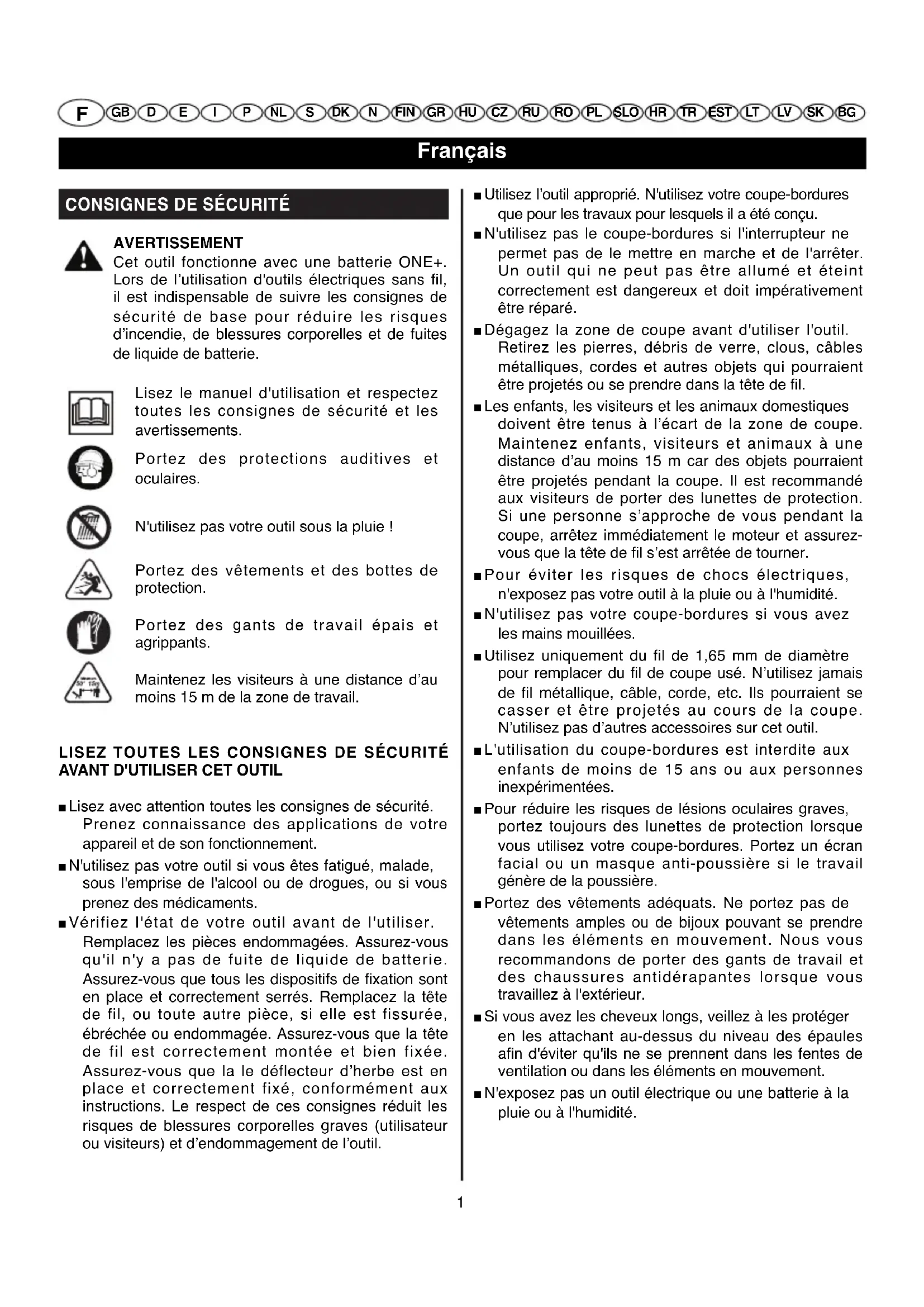 Lisez avec attention toutes les consignes de sécurité. Prenez connaissance des applications de votre appareil et de son fonctionnement. N'utilisez pas votre outil si vous êtes fatigué, malade, sous l'emprise de l'alcool ou de drogues, ou si vous prenez des médicaments. Vérifiez l'état de votre outil avant de l'utiliser. Remplacez les pièces endommagées. Assurez-vous qu'il n'y a pas de fuite de liquide de batterie. Assurez-vous que tous les dispositifs de fixation sont en place et correctement serrés. Remplacez la tête de fil, ou toute autre pièce, si elle est fissurée, ébréchée ou endommagée. Assurez-vous que la tête de fil est correctement montée et bien fixée. Assurez-vous que le déflecteur d'herbe est en place et correctement fixé, conformément aux instructions. Le respect de ces consignes réduit les risques de blessures corporelles graves (utilisateur ou visiteurs) et d'endommagement de l'outil.