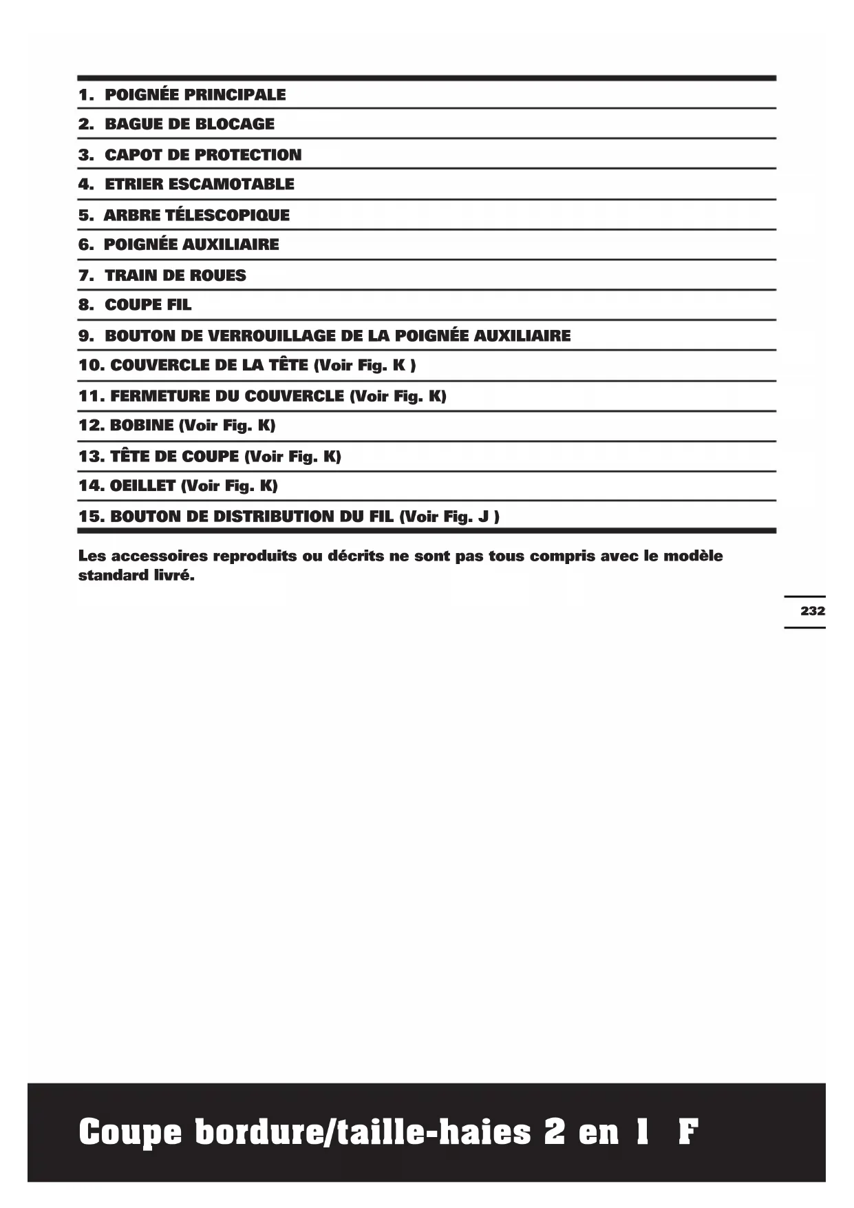 Planifiez votre travail pour étaler l’utilisation des outils à forte vibration sur plusieurs jours. ACCESSOIRES Capot de protection 1 Poignée auxiliaire 1 Train de roues 1 Etrier escamotable 1 Nous recommandons d’acheter tous les accessoires dans le magasin d’acquisition de l’outil. Il est impératif d’utiliser des accessoires de bonne qualité et de marque connue et de choisir l’accessoire correct recommandé dans ce manuel. Pour plus d’informations, se référer à l’emballage des accessoires. Le personnel du magasin est également là pour vous conseiller.Coupe bordure/taille-haies 2 en 1 F