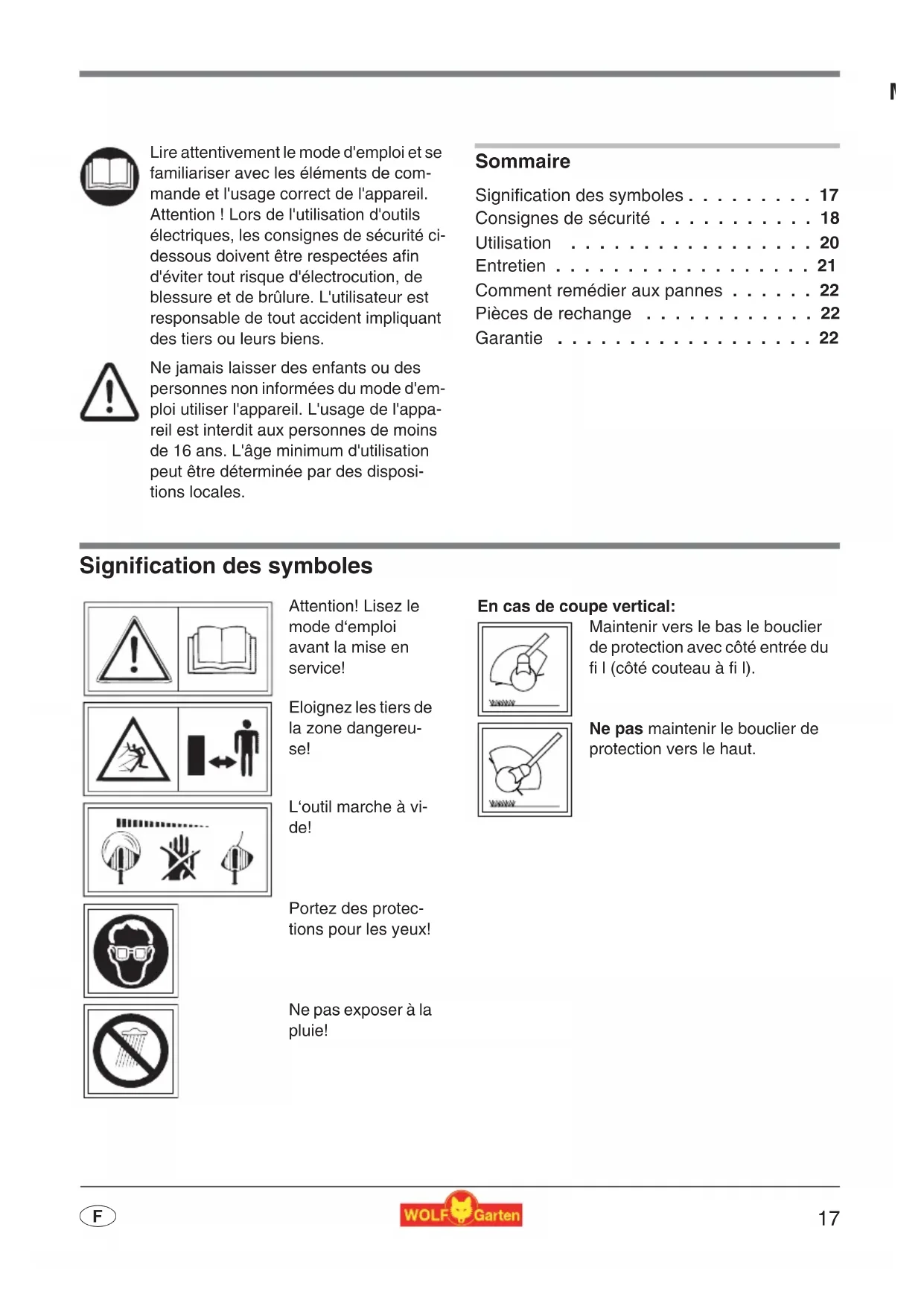 L'appareil est idéal pour l'entretien des bords de pelouses et de petites pelouses privées. Cette tondeuse apparat uitzetten en de steker eruit halen. à fil WOLF n'est pas à utiliser dans les jardins publics, les parcs, les stades etc. et même pas dans l'agriculture et activité forestière. - A cause d'accidents possibles, l'appareil ne doit pas être utilisé: - pour tondre des buissons, haies et des arbres; - pour découper des fleurs; - pour couper des résidus jardinières en morceaux. - Ces outils ne sont pas destinés à être utilisés par des personnes possédant une expérience et/ou un savoir insuffisant ni par des personnes aux capacités physiques, sensorielles ou mentales aliénées, sauf si elles sont encadrées par une personne responsable de leur sécurité ou ont reçu de cette personne des instructions comment utiliser l'outil. - L'utilisation de ces outils est interdite aux mineurs de moins de 16 ans. - Arrête l'appareil, lorsque des personnes, mais surtout des enfants ou des animaux domestiques, se trouvent à proximité. Veillez à ce qu'il n'y ait personne (particulièrement des enfants) à proximité immédiate de l'appareil en action. Vous êtes responsable. N'utiliser l'appareil qu'à la lumière du jour ou à luminosité artificielle équivalente. - Ne l'utilisez pas quand l'herbe est mouillée et ne le laissez pas dehors quand il pleut. - Ne jamais monter d'éléments de coupe métalliques.