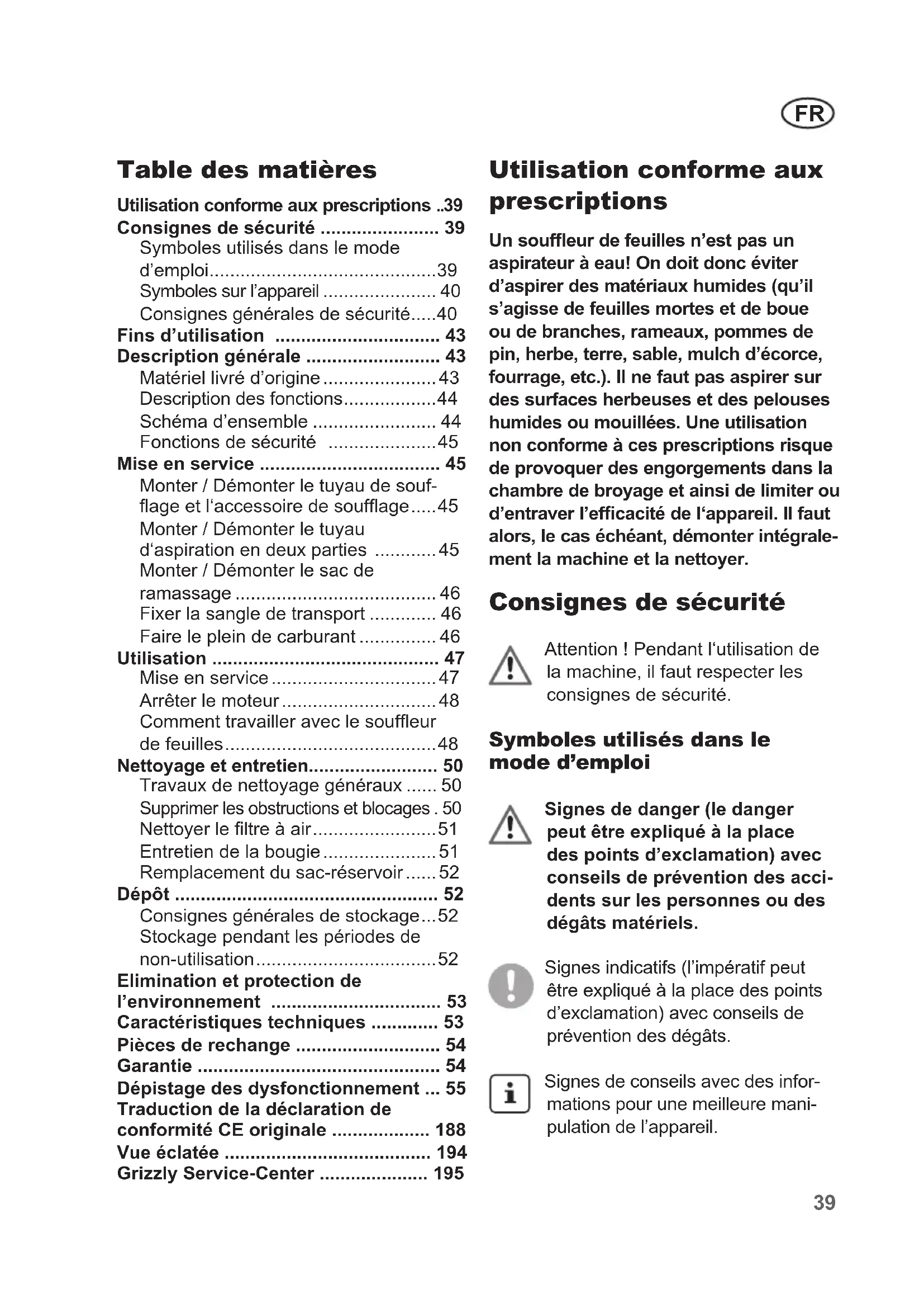 Consignes de sécurité .... 39