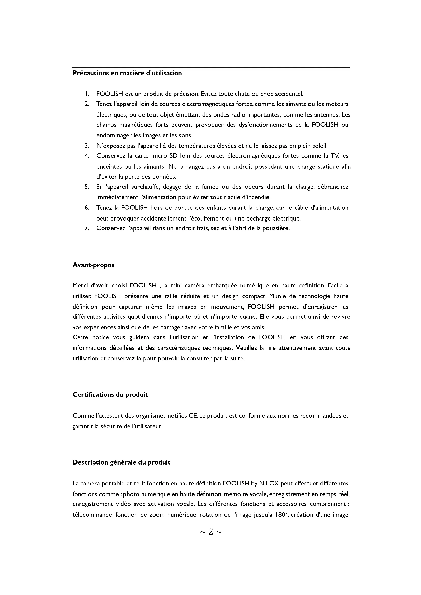 Avant-propos Merci d’avoir choisi FOOLISH , la mini caméra embarquée numérique en haute définition. Facile à utiliser, FOOLISH présente une taille réduite et un design compact. Munie de technologie haute définition pour capturer même les images en mouvement, FOOLISH permet d’enregistrer les différentes activités quotidiennes n’importe où et n’importe quand. Elle vous permet ainsi de revivre vos expériences ainsi que de les partager avec votre famille et vos amis. Cette notice vous guidera dans l’utilisation et l’installation de FOOLISH en vous offrant des informations détaillées et des caractéristiques techniques. Veuillez la lire attentivement avant toute utilisation et conservez-la pour pouvoir la consulter par la suite. Certifications du produit Comme l’attestent des organismes notifiés CE, ce produit est conforme aux normes recommandées et garantit la sécurité de l’utilisateur. Description générale du produit La caméra portable et multifonction en haute définition FOOLISH by NILOX peut effectuer différentes fonctions comme : photo numérique en haute définition, mémoire vocale, enregistrement en temps réel, enregistrement vidéo avec activation vocale. Les différentes fonctions et accessoires comprennent : télécommande, fonction de zoom numérique, rotation de l’image jusqu’à 180°, création d’une image~ 3 ~ spéculaire, écran couleur TFT, touches multifonction, indicateur laser, transmission des données à grande vitesse via connexion USB, sortie HDMI en haute définition, voyants de batterie déchargée et espace résiduel en mémoire, possibilité de chargement via connexion USB. Ce produit, ainsi que ses accessoires, est le résultat de différentes technologies brevetées et il permet de filmer n’importe quelle scène à n’importe quel moment où que vous soyez. Structure du produit (schéma descriptif)