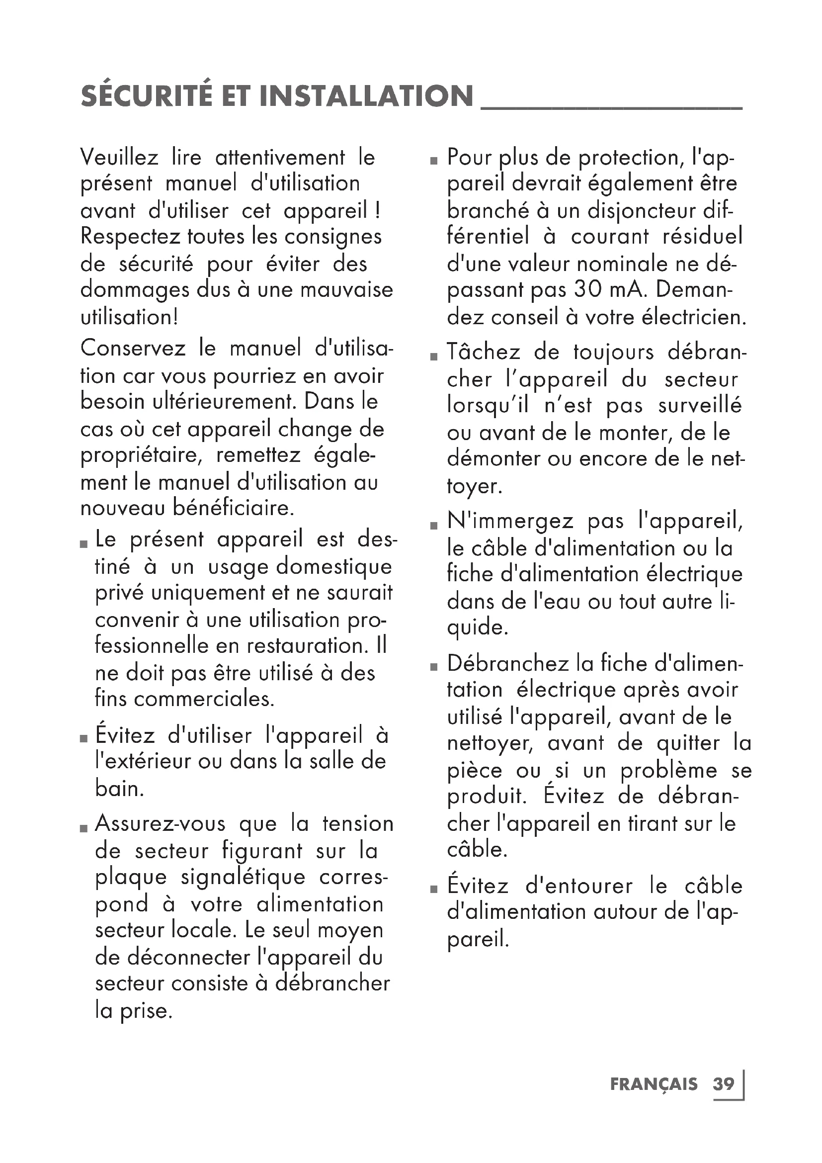 Veuillez lire attentivement le présent manuel d'utilisation avant d'utiliser cet appareil ! Respectez toutes les consignes de sécurité pour éviter des dommages dus à une mauvaise utilisation! Conservez le manuel d'utilisa- tion car vous pourriez en avoir besoin ultérieurement. Dans le cas où cet appareil change de propriétaire, remettez égale- ment le manuel d'utilisation au nouveau bénéficiaire.