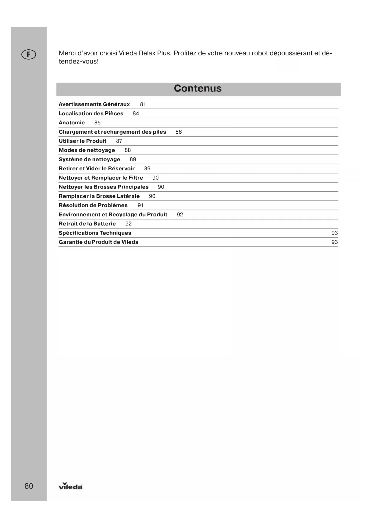 Merci d’avoir choisi Vileda Relax Plus. Profitez de votre nouveau robot dépoussiérant et dé- tendez-vous! Contenus Avertissements Généraux 81 Localisation des Pièces 84 Anatomie 85 Chargement et rechargement des piles 86 Utiliser le Produit 87 Modes de nettoyage 88 Système de nettoyage 89 Retirer et Vider le Réservoir 89 Nettoyer et Remplacer le Filtre 90 Nettoyer les Brosses Principales 90 Remplacer la Brosse Latérale 90 Résolution de Problèmes 91 Environnement et Recyclage du Produit 92 Retrait de la Batterie 92 Spécifications Techniques 93 Garantie du Produit de Vileda 9381