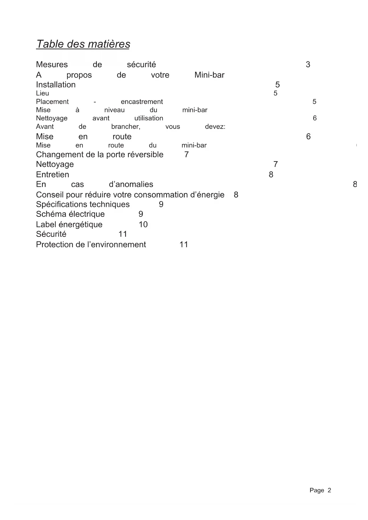 Lorsque you choisissez le lieu d'installation de votre mini-bar, vous devez vous assurer que le sol est plat et ferme, et que la pierce est bien ventilée avec une température entre 16 et 32^ . Evitez de l'installer a cotoé d'une source de chaleur, comme une cuisine, une chaudière ou un radiateur, etc...