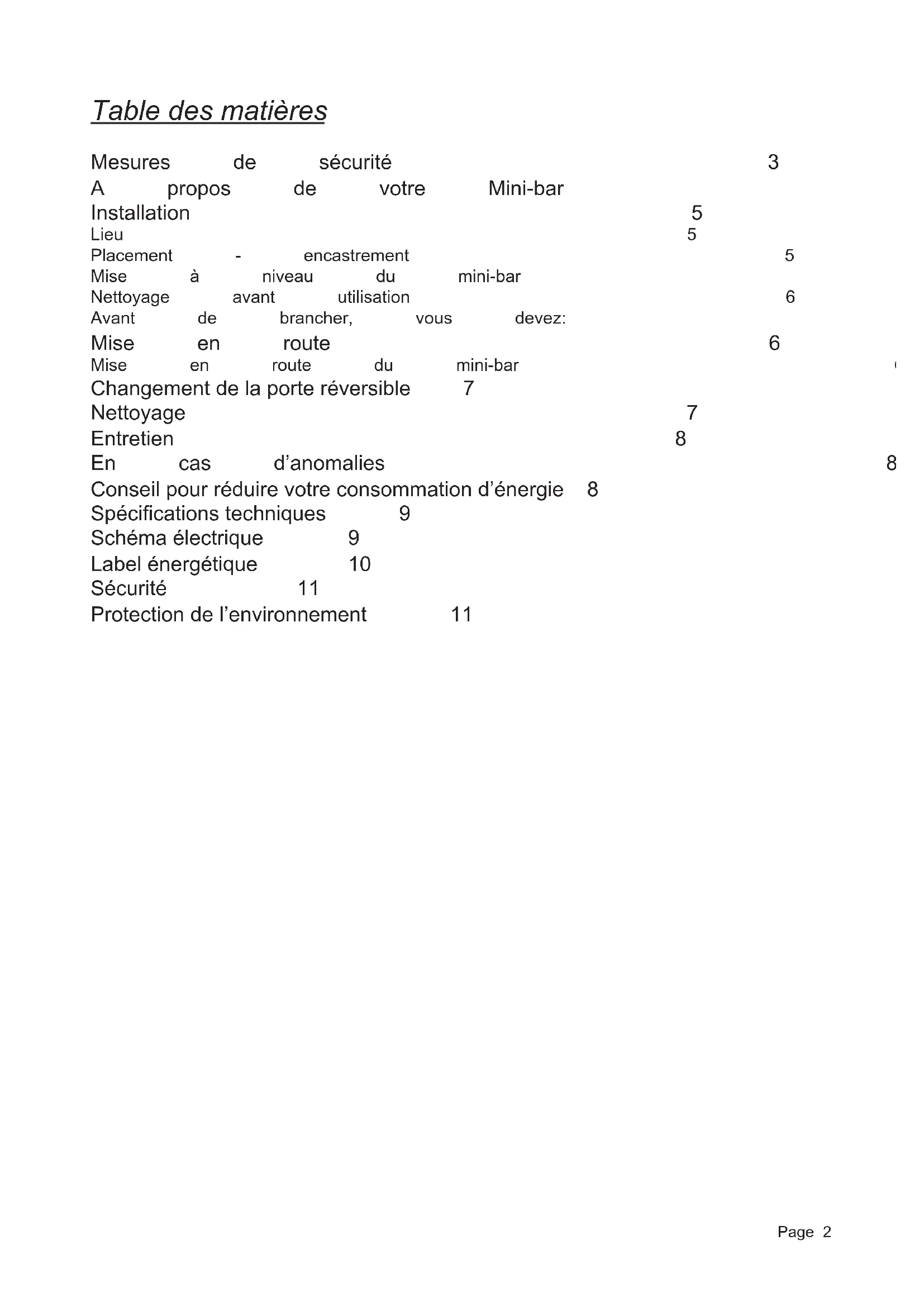 NOTE: Ne pas stocker dans le mini-bar des gaz ou liquides inflammables.