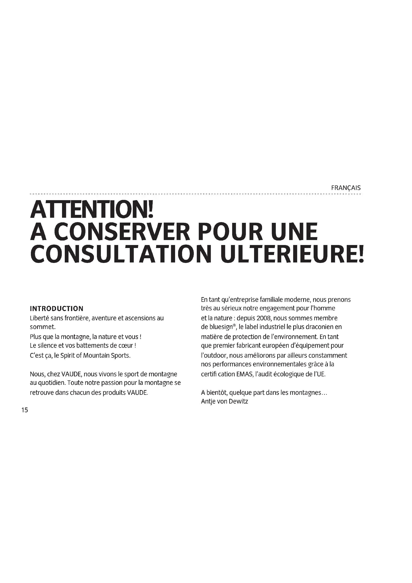 - Do not stake out the guy lines over paths or trails. These can be easily tripped over in the dark. ENGLISH15 FRANÇAIS INTRODUCTION Liberté sans frontière, aventure et ascensions au sommet. Plus que la montagne, la nature et vous ! Le silence et vos battements de cœur ! C’est ça, le Spirit of Mountain Sports. Nous, chez VAUDE, nous vivons le sport de montagne au quotidien. Toute notre passion pour la montagne se retrouve dans chacun des produits VAUDE. En tant qu’entreprise familiale moderne, nous prenons très au sérieux notre engagement pour l’homme et la nature : depuis 2008, nous sommes membre de bluesign®, le label industriel le plus draconien en matière de protection de l’environnement. En tant que premier fabricant européen d’équipement pour l’outdoor, nous améliorons par ailleurs constamment nos performances environnementales grâce à la certifi cation EMAS, l’audit écologique de l’UE. A bientôt, quelque part dans les montagnes… Antje von Dewitz ATTENTION!