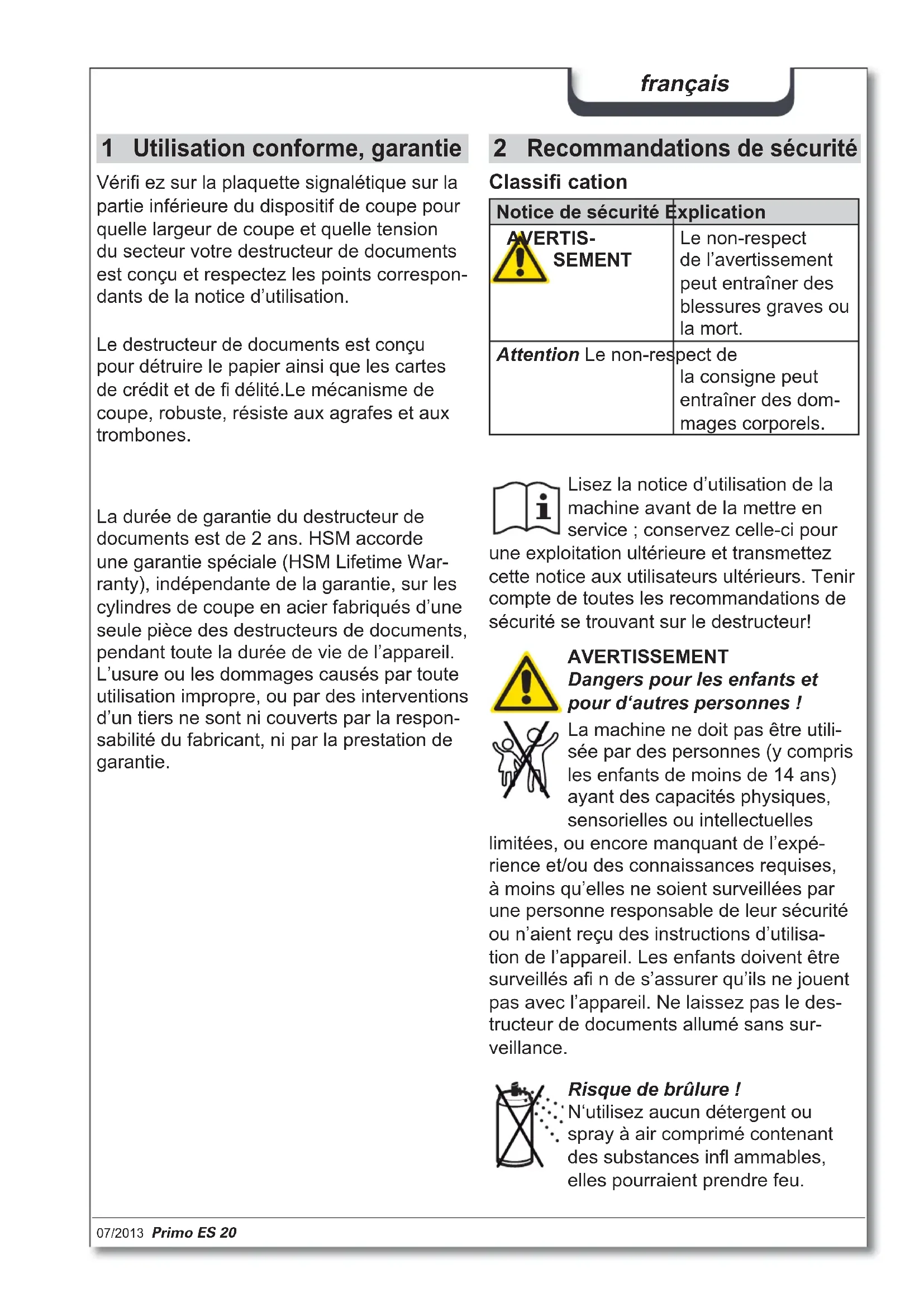 Recommandations de sécurité Classifi cation Notice de sécurité Explication AVERTIS- SEMENT Le non-respect de l’avertissement peut entraîner des blessures graves ou la mort. Attention Le non-respect de la consigne peut entraîner des dom- mages corporels. Lisez la notice d’utilisation de la machine avant de la mettre en service ; conservez celle-ci pour une exploitation ultérieure et transmettez cette notice aux utilisateurs ultérieurs. Tenir compte de toutes les recommandations de sécurité se trouvant sur le destructeur! AVERTISSEMENT Dangers pour les enfants et pour d‘autres personnes ! La machine ne doit pas être utili- sée par des personnes (y compris les enfants de moins de 14 ans) ayant des capacités physiques, sensorielles ou intellectuelles limitées, ou encore manquant de l’expé- rience et/ou des connaissances requises, à moins qu’elles ne soient surveillées par une personne responsable de leur sécurité ou n’aient reçu des instructions d’utilisa- tion de l’appareil. Les enfants doivent être surveillés afi n de s’assurer qu’ils ne jouent pas avec l’appareil. Ne laissez pas le des- tructeur de documents allumé sans sur- veillance. La durée de garantie du destructeur de documents est de 2 ans. HSM accorde une garantie spéciale (HSM Lifetime War- ranty), indépendante de la garantie, sur les cylindres de coupe en acier fabriqués d’une seule pièce des destructeurs de documents, pendant toute la durée de vie de l’appareil. L’usure ou les dommages causés par toute utilisation impropre, ou par des interventions d’un tiers ne sont ni couverts par la respon- sabilité du fabricant, ni par la prestation de garantie. Vérifi ez sur la plaquette signalétique sur la partie inférieure du dispositif de coupe pour quelle largeur de coupe et quelle tension du secteur votre destructeur de documents est conçu et respectez les points correspon- dants de la notice d’utilisation. Risque de brûlure ! N‘utilisez aucun détergent ou spray à air comprimé contenant des substances infl ammables, elles pourraient prendre feu. Le destructeur de documents est conçu pour détruire le papier ainsi que les cartes de crédit et de fi délité. Le mécanisme de coupe, robuste, résiste aux agrafes et aux trombones.16 Primo ES 20 07/2013 français AVERTISSEMENT Dangers résultant de la tension du secteur ! Une mauvaise utilisation de la machine peut entraîner une électrocution. – Vérifi ez avant de brancher la prise sec- teur que la tension et la fréquence de votre réseau électrique correspondent aux indications de la plaque signalétique. – Assurez-vous que la prise secteur est accessible. – Evitez que de l’eau pénètre dans le des- tructeur de documents. Ne plongez ni les câbles secteur ni la fi che secteur dans l’eau. – Ne touchez jamais la fi che secteur lorsque vous avez les mains mouillées. – Ne tirez jamais sur le câble pour débran- cher la fi che de la prise secteur, tenez toujours la fi che. – Utilisez l’appareil uniquement à l’intérieur, dans des pièces sans humidité. Ne l’utili- sez jamais dans des pièces humides ou sous la pluie. AVERTISSEMENT Danger de blessure. Ne jamais passer la main, les doigts ou un objet étranger dans la fente de l‘ouverture d‘insertion du papier. Danger de blessure par attrac- tion. Ne pas approcher l‘ouverture d‘in- sertion du papier avec des che- veux longs, des vêtements larges, des cravates, des écharpes, des bracelets, des colliers, etc. Ne pas détruire les objets ayant tendance à s‘entortiller, bandes, matériel de ligaturage etc. Vérifi ez régulièrement que l’appa- reil et les câbles ne présentent aucun dommage. Eteignez le destructeur de documents en cas de détérioration ou de dysfonctionne- ment, ainsi qu’avant un changement de place ou un nettoyage, et débranchez la prise secteur. – Gardez l’appareil, la fi che secteur et le câble secteur éloigné de tout feu et de surfaces chaudes. Veillez à ce que rien n’obstrue les fentes d’aération et à ce que l’appareil respecte une distance minimum de 5 cm du mur ou des meubles. – L’appareil n’est pas conçu pour une utilisation à proximité immédiate d’écrans et de postes de travail. Les travaux d’entretien ne peuvent être réalisés que par le service après-vente HSM et les techniciens de maintenance de nos partenaires contractuels. Pour les adresses du service clientèle, voir page 68. HSM garantit la livraison de pièces déta- chées jusqu‘à 10 ans après la fi n de la pro- duction de ce modèle. Attention Danger résultant d’une utilisation non conforme Utilisez la machine uniquement selon les consignes du chapitre « utilisation conforme ».07/2013 Primo ES 20 17 français 3 Vue générale 1 Corbeille 2 Dispositif de coupe 3 Recommandations de sécurité, disposi- tif de sécurité 4 Fente d‘introduction pour papier et cartes crédit/cartes de fi délité 5 Contacteur de démarrage 6 Bouton retour R: retour 7 Plaquette signalétique sur la partie inférieure du dispositif de coupe 4 Ampleur de la livraison