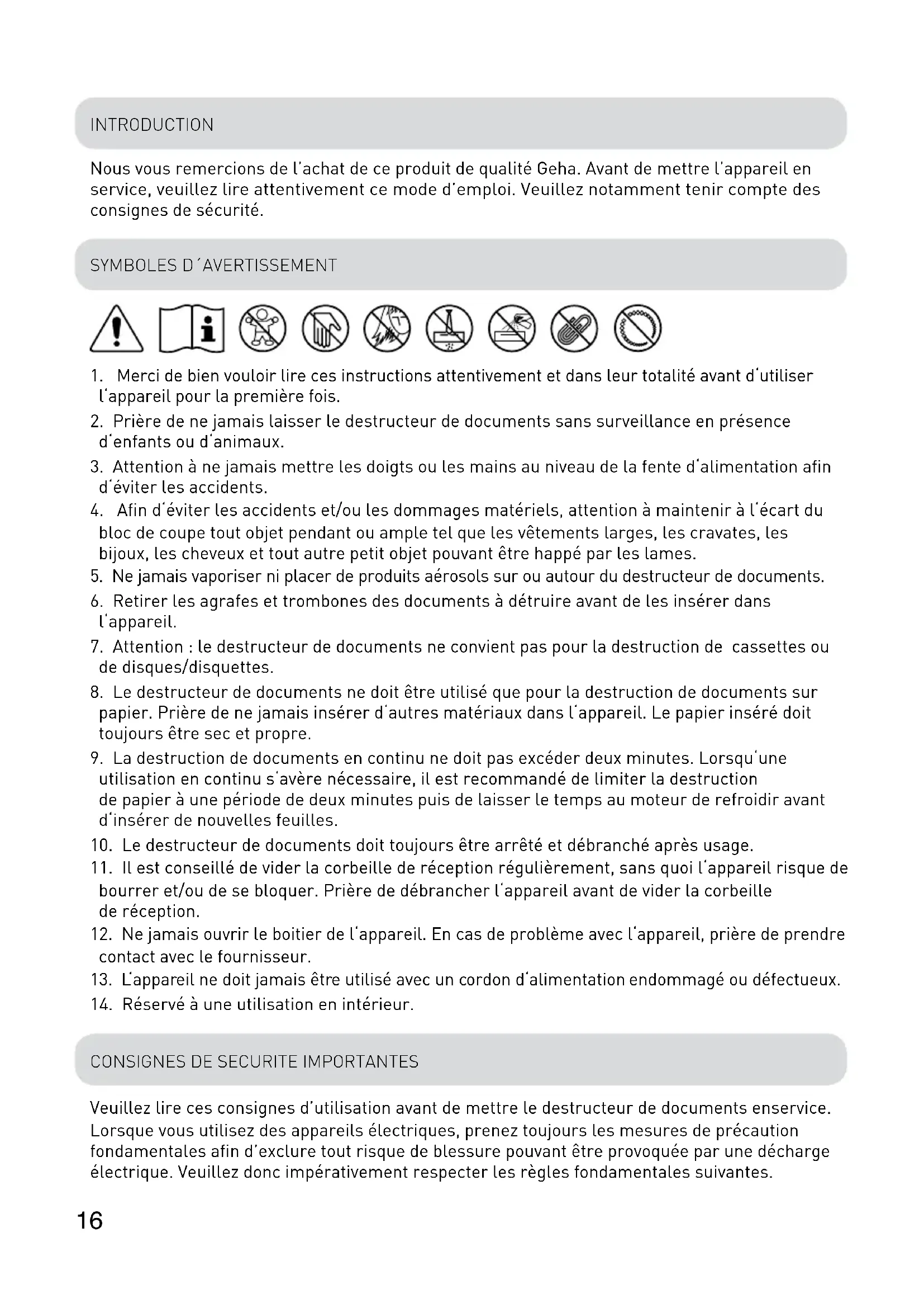 Nous vous remercions de l’achat de ce produit de qualité Geha. Avant de mettre l’appareil en service, veuillez lire attentivement ce mode d’emploi. Veuillez notamment tenir compte des consignes de sécurité. Veuillez lire ces consignes d’utilisation avant de mettre le destructeur de documents enservice. Lorsque vous utilisez des appareils électriques, prenez toujours les mesures de précaution fondamentales afin d’exclure tout risque de blessure pouvant être provoquée par une décharge électrique. Veuillez donc impérativement respecter les règles fondamentales suivantes.