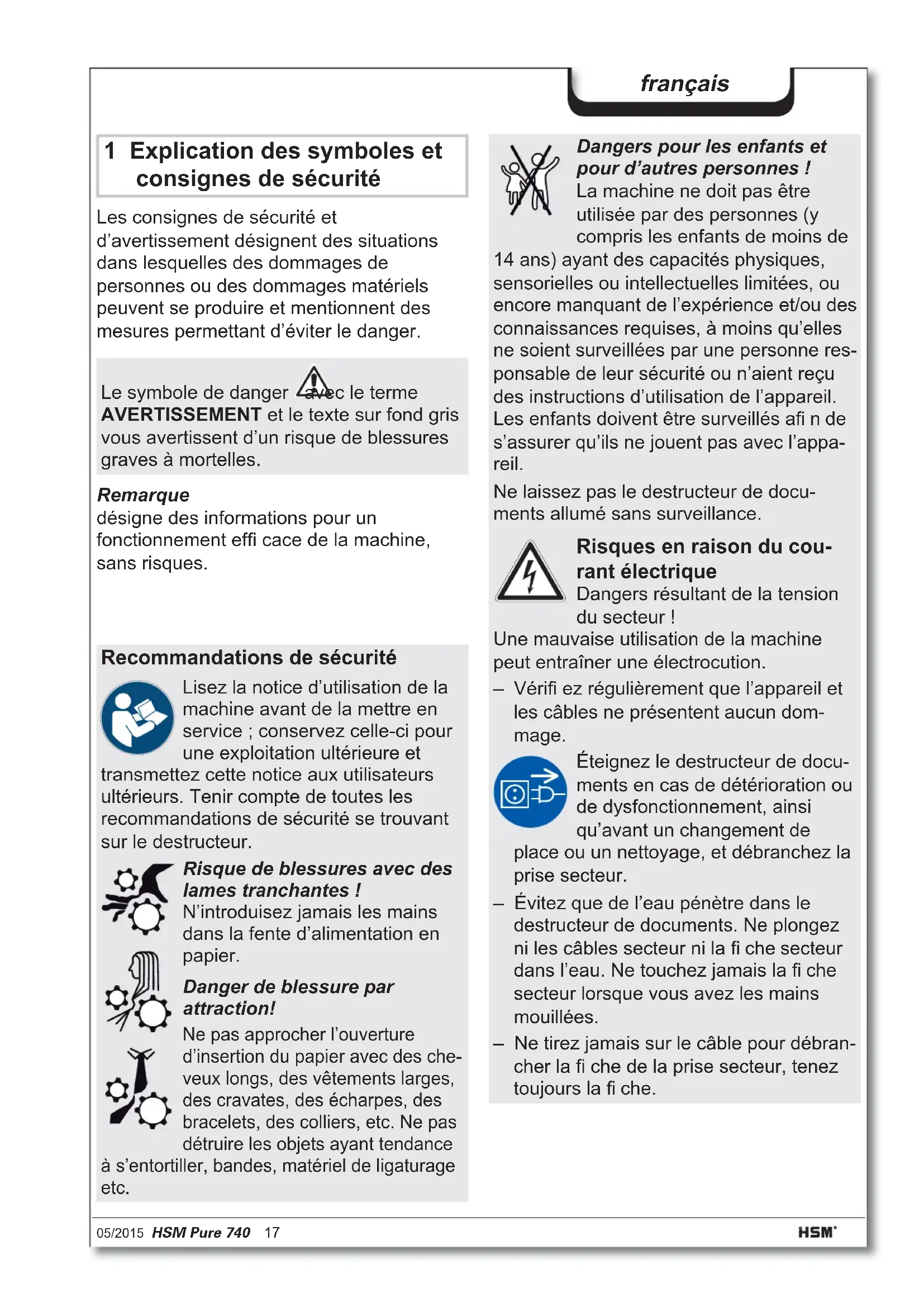 Weight 50 kg 56 kg Cutting speed 70 mm/s 60 mm/s Intake width 400 mm Power supply 230 V, 50 Hz 120 V, 60 Hz 220 V, 60 Hz Power consumption with max. number of sheets 590 W Operating mode Continuous operation Ambient conditions in operation: Temperature Relative humidity Height above sea-level (MSL) -10 °C to +25 °C max. 90 %, without condensation max. 2,000 m Size W x D x H (mm) 620 x 487 x 889 Shredded material container volume 145 litres Sound pressure level emissions (Idle running/ load) 56 dB(A) / 59-63 dB(A)05/2015 HSM Pure 740 17 français 1 Explication des symboles et consignes de sécurité Les consignes de sécurité et d’avertissement désignent des situations dans lesquelles des dommages de personnes ou des dommages matériels peuvent se produire et mentionnent des mesures permettant d’éviter le danger. Remarque désigne des informations pour un fonctionnement effi cace de la machine, sans risques. Le symbole de danger avec le terme AVERTISSEMENT et le texte sur fond gris vous avertissent d’un risque de blessures graves à mortelles. Recommandations de sécurité Lisez la notice d’utilisation de la machine avant de la mettre en service ; conservez celle-ci pour une exploitation ultérieure et transmettez cette notice aux utilisateurs ultérieurs. Tenir compte de toutes les recommandations de sécurité se trouvant sur le destructeur. Risque de blessures avec des lames tranchantes ! N’introduisez jamais les mains dans la fente d’alimentation en papier. Danger de blessure par attraction! Ne pas approcher l’ouverture d’insertion du papier avec des che- veux longs, des vêtements larges, des cravates, des écharpes, des bracelets, des colliers, etc. Ne pas détruire les objets ayant tendance à s’entortiller, bandes, matériel de ligaturage etc. Dangers pour les enfants et pour d’autres personnes ! La machine ne doit pas être utilisée par des personnes (y compris les enfants de moins de 14 ans) ayant des capacités physiques, sensorielles ou intellectuelles limitées, ou encore manquant de l’expérience et/ou des connaissances requises, à moins qu’elles ne soient surveillées par une personne res- ponsable de leur sécurité ou n’aient reçu des instructions d’utilisation de l’appareil. Les enfants doivent être surveillés afi n de s’assurer qu’ils ne jouent pas avec l’appa- reil. Ne laissez pas le destructeur de docu- ments allumé sans surveillance. Risques en raison du cou- rant électrique Dangers résultant de la tension du secteur ! Une mauvaise utilisation de la machine peut entraîner une électrocution. – Vérifi ez régulièrement que l’appareil et les câbles ne présentent aucun dom- mage. Éteignez le destructeur de docu- ments en cas de détérioration ou de dysfonctionnement, ainsi qu’avant un changement de place ou un nettoyage, et débranchez la prise secteur. – Évitez que de l’eau pénètre dans le destructeur de documents. Ne plongez ni les câbles secteur ni la fi che secteur dans l’eau. Ne touchez jamais la fi che secteur lorsque vous avez les mains mouillées. – Ne tirez jamais sur le câble pour débran- cher la fi che de la prise secteur, tenez toujours la fi che.18 HSM Pure 740 05/2015 français