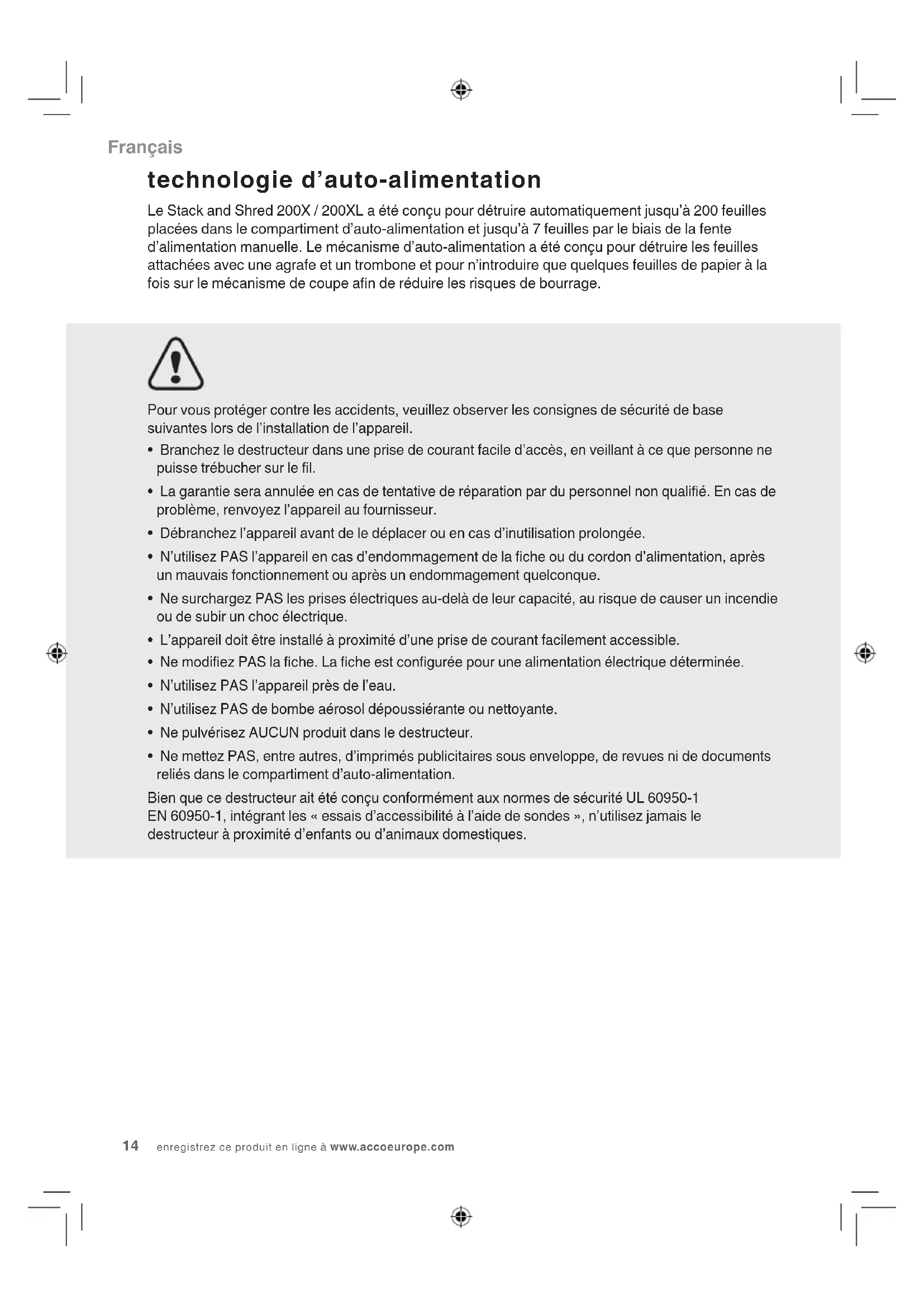 - Ne mettez PAS, entre autres, d’imprimés publicitaires sous enveloppe, de revues ni de documents reliés dans le compartiment d’auto-alimentation. Bien que ce destructeur ait été conçu conformément aux normes de sécurité UL 60950-1 EN 60950-1, intégrant les « essais d’accessibilité à l’aide de sondes », n’utilisez jamais le destructeur à proximité d’enfants ou d’animaux domestiques. technologie d’auto-alimentation Le Stack and Shred 200X / 200XL a été conçu pour détruire automatiquement jusqu’à 200 feuilles placées dans le compartiment d’auto-alimentation et jusqu’à 7 feuilles par le biais de la fente d’alimentation manuelle. Le mécanisme d’auto-alimentation a été conçu pour détruire les feuilles attachées avec une agrafe et un trombone et pour n’introduire que quelques feuilles de papier à la fois sur le mécanisme de coupe an de réduire les risques de bourrage. FrançaisSTACK-AND-SHRED 200X&200XL
