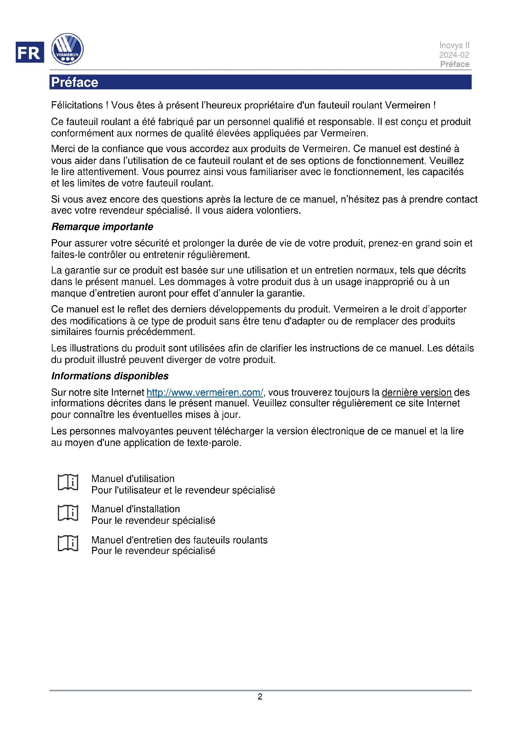 Préface Félicitations ! Vous êtes à présent l’heureux propriétaire d'un fauteuil roulant Vermeiren ! Ce fauteuil roulant a été fabriqué par un personnel qualifié et responsable. Il est conçu et produit conformément aux normes de qualité élevées appliquées par Vermeiren. Merci de la confiance que vous accordez aux produits de Vermeiren. Ce manuel est destiné à vous aider dans l’utilisation de ce fauteuil roulant et de ses options de fonctionnement. Veuillez le lire attentivement. Vous pourrez ainsi vous familiariser avec le fonctionnement, les capacités et les limites de votre fauteuil roulant. Si vous avez encore des questions après la lecture de ce manuel, n’hésitez pas à prendre contact avec votre revendeur spécialisé. Il vous aidera volontiers. Remarque importante Pour assurer votre sécurité et prolonger la durée de vie de votre produit, prenez-en grand soin et faites-le contrôler ou entretenir régulièrement. La garantie sur ce produit est basée sur une utilisation et un entretien normaux, tels que décrits dans le présent manuel. Les dommages à votre produit dus à un usage inapproprié ou à un manque d’entretien auront pour effet d’annuler la garantie. Ce manuel est le reflet des derniers développements du produit. Vermeiren a le droit d’apporter des modifications à ce type de produit sans être tenu d'adapter ou de remplacer des produits similaires fournis précédemment. Les illustrations du produit sont utilisées afin de clarifier les instructions de ce manuel. Les détails du produit illustré peuvent diverger de votre produit. Informations disponibles Sur notre site Internet http://www.vermeiren.com/, vous trouverez toujours la dernière version des informations décrites dans le présent manuel. Veuillez consulter régulièrement ce site Internet pour connaître les éventuelles mises à jour. Les personnes malvoyantes peuvent télécharger la version électronique de ce manuel et la lire au moyen d'une application de texte-parole.