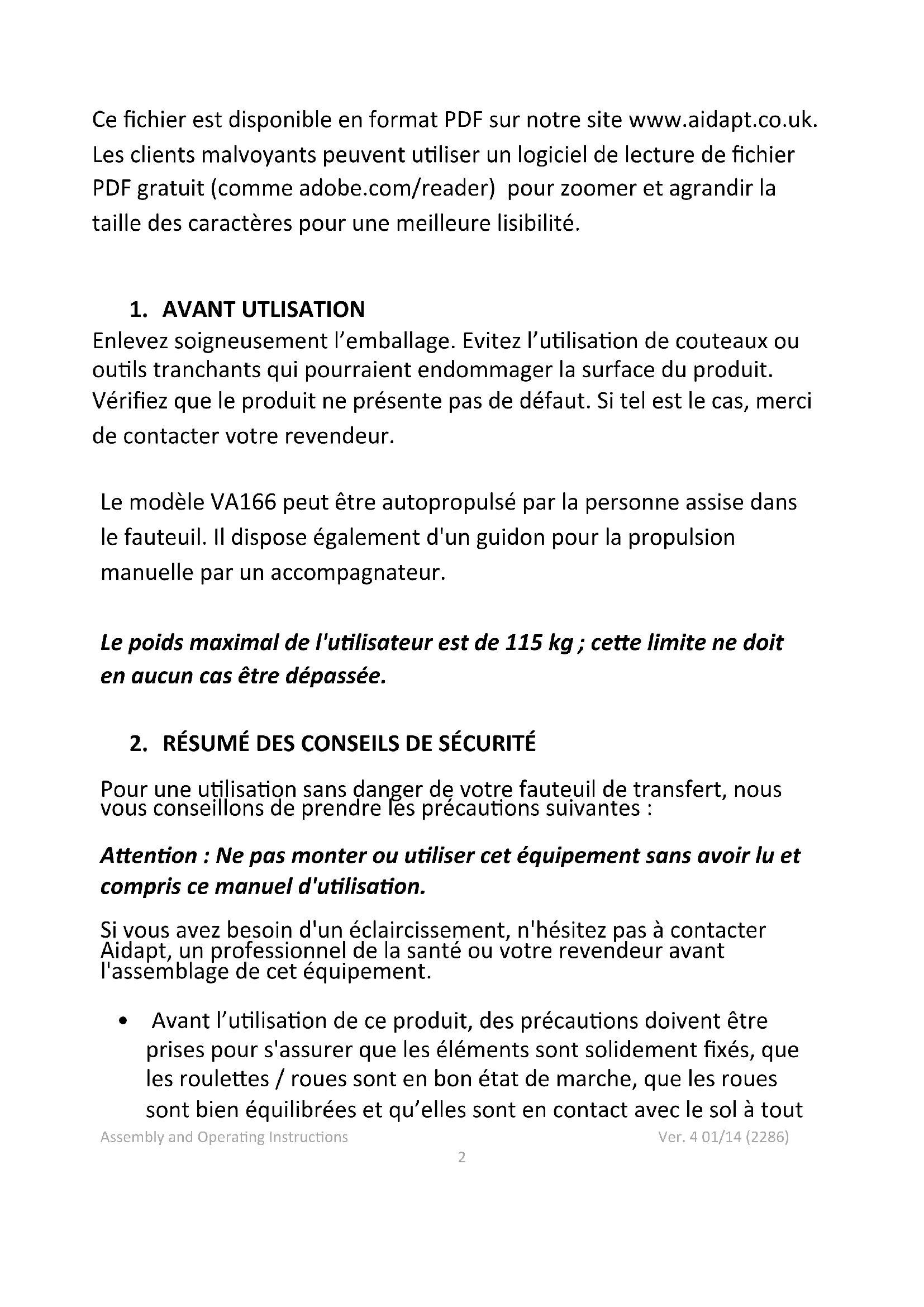 VA166 - Fauteuil roulant Aidapt - Notice d'utilisation et mode d'emploi gratuit