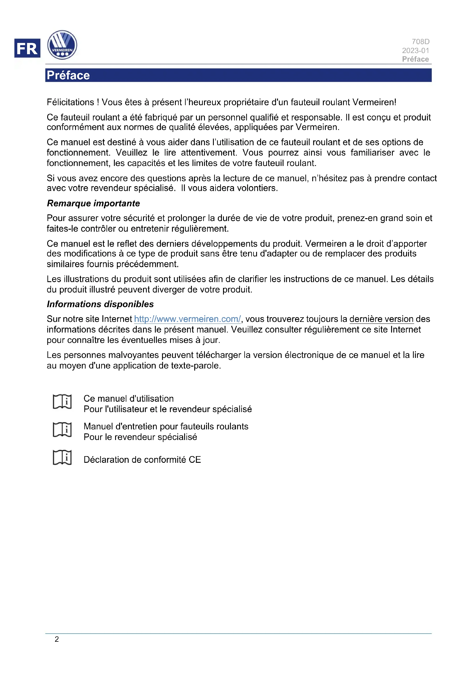 Préface Félicitations ! Vous êtes à présent l’heureux propriétaire d'un fauteuil roulant Vermeiren! Ce fauteuil roulant a été fabriqué par un personnel qualifié et responsable. Il est conçu et produit conformément aux normes de qualité élevées, appliquées par Vermeiren. Ce manuel est destiné à vous aider dans l’utilisation de ce fauteuil roulant et de ses options de fonctionnement. Veuillez le lire attentivement. Vous pourrez ainsi vous familiariser avec le fonctionnement, les capacités et les limites de votre fauteuil roulant. Si vous avez encore des questions après la lecture de ce manuel, n’hésitez pas à prendre contact avec votre revendeur spécialisé. Il vous aidera volontiers. Remarque importante Pour assurer votre sécurité et prolonger la durée de vie de votre produit, prenez-en grand soin et faites-le contrôler ou entretenir régulièrement. Ce manuel est le reflet des derniers développements du produit. Vermeiren a le droit d’apporter des modifications à ce type de produit sans être tenu d'adapter ou de remplacer des produits similaires fournis précédemment. Les illustrations du produit sont utilisées afin de clarifier les instructions de ce manuel. Les détails du produit illustré peuvent diverger de votre produit. Informations disponibles Sur notre site Internet http://www.vermeiren.com/, vous trouverez toujours la dernière version des informations décrites dans le présent manuel. Veuillez consulter régulièrement ce site Internet pour connaître les éventuelles mises à jour. Les personnes malvoyantes peuvent télécharger la version électronique de ce manuel et la lire au moyen d'une application de texte-parole.