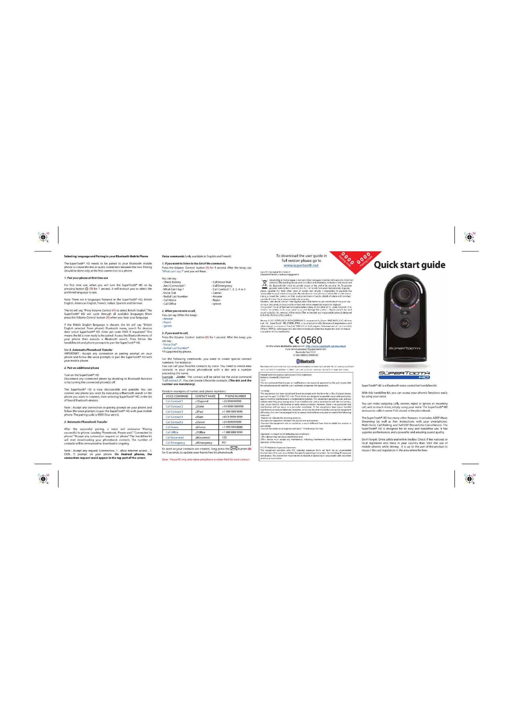The Bluetooth® word mark and logos are registered trademarks owned by Bluetooth SIG, Inc. and any use of such marks by Euro-CB is under license. Other trademarks and trade names are those of their respective owners. Correct Disposal of This Product (Waste Electrical & Electronic Equipment) (Applicable in the European Union and other European countries with separate collection systems). This marking shown on the product or its literature, indicates that it should not be disposed with other household wastes at the end of its working life. To prevent possible harm to the environment or human health from uncontrolled waste disposal, please separate this from other types of wastes and recycle it responsibly to promote the sustainable reuse of material resources. Household users should contact either the retailer where they purchased this product, or their local government oce, for details of where and how they can take this item for environmentally safe recycling. Business users should contact their supplier and check the terms and conditions of the purchase contract. This product should not be mixed with other commercial wastes for disposal. This product has an embedded, non-replaceable battery, do not attempt to open the product or remove the battery as this may cause injury and damage the product. Please contact the local recycling facility for removal of the battery. The embedded, non-replaceable battery is designed to last the life time of the product. Hereby, EURO COMMUNICATION EQUIPEMENTS, represented by Xavier MARCHANT, CEO, declares that the SuperTooth® HD, MODEL BTHD, is in compliance with the essential requirements and other relevant provisions of Directive 1999/5/EC of the European Parliament and of the Council of 9 March 1999 on radio equipment and telecommunications terminal equipment and the mutual recognition of their conformity.(Applicable dans les pays de l’Union Européenne et dans les autres pays européens disposant de systèmes de collecte sélective) Ce symbole sur le produit ou sa documentation indique qu’il ne doit pas être éliminé en n de vie avec les autres déchets ménagers. L’élimination incontrôlée des déchets pouvant porter préjudice à l’environnement ou à la santé humaine, veuillez le séparer des autres types de déchets et le recycler de façon responsable. Vous favoriserez ainsi la réutilisation durable des ressources matérielles. Les particuliers sont invités à contacter le distributeur leur ayant vendu le produit ou à se renseigner auprès de leur mairie pour savoir où et comment ils peuvent se débarrasser de ce produit an qu’il soit recyclé en respectant l’environnement. Les entreprises sont invitées à contacter leurs fournisseurs et à consulter les conditions de leur contrat de vente. Ce produit ne doit pas être éliminé avec les autres déchets commerciaux. Ce produit contient une batterie non remplaçable. N'essayez pas d'ouvrir le produit ou d'enlever la batterie car cela endommagerait le produit. Veuillez contacter le centre de recyclage le plus proche pour collecter la batterie. La batterie non-remplaçable est conçue pour durer autant que le produit. Par la présente, EURO COMMUNICATION EQUIPEMENTS, représentée par Xavier Marchant, Président Directeur Général, déclare que l'appareil SuperTooth HD, MODELE BTHD, est conforme aux exigences essentielles de la directive 1995/5/EC du Parlement Européen et du Conseil du 9 Mars 1999 concernant les équipements hertziens et les équipements terminaux de télécommunications et la reconnaissance mutuelle de leur conformité.