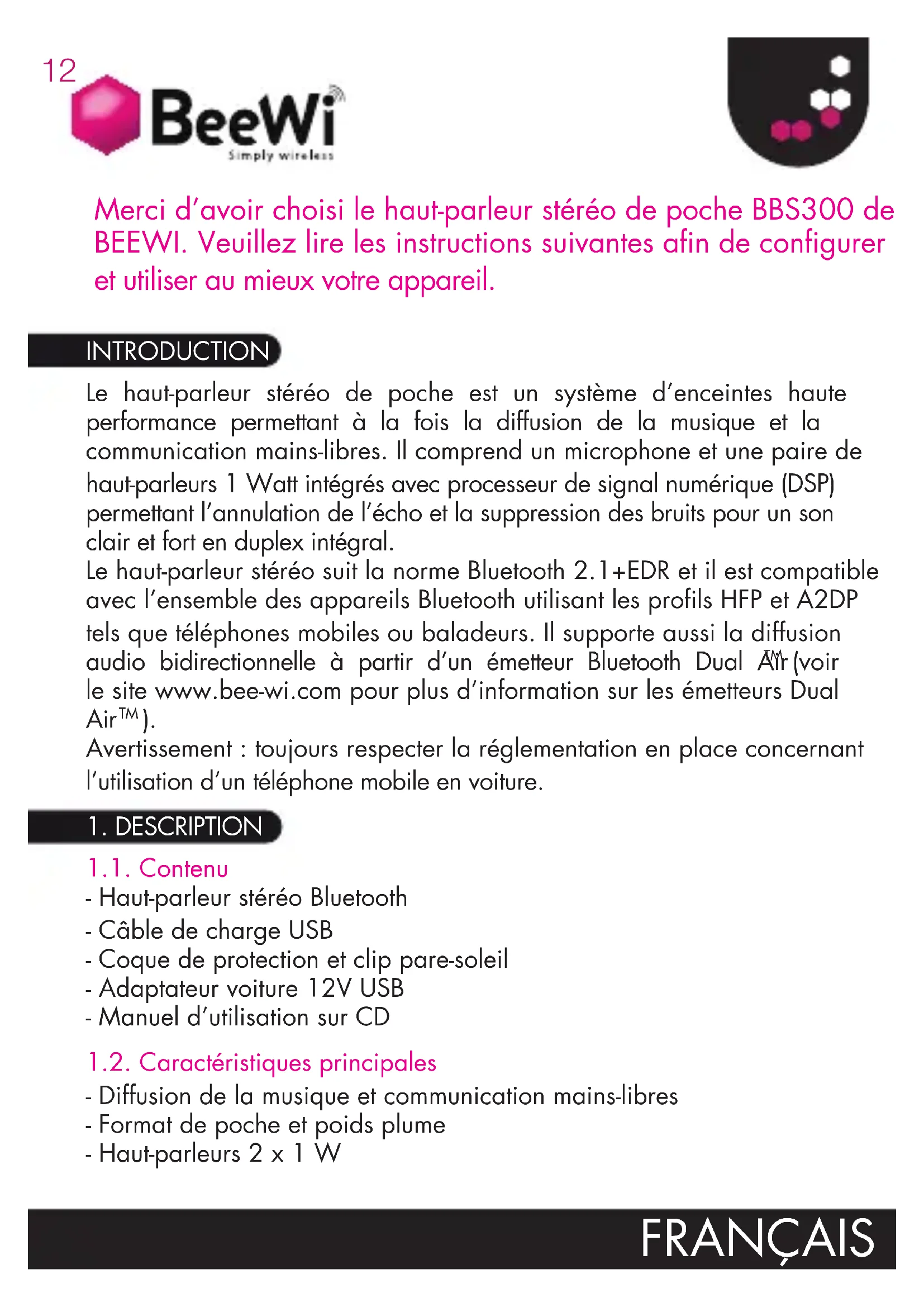 l’utilisation d’un téléphone mobile en voiture. 1.1. Contenu - Haut-parleur stéréo Bluetooth - Câble de charge USB - Coque de protection et clip pare-soleil - Adaptateur voiture 12V USB - Manuel d’utilisation sur CD 1.2. Caractéristiques principales - Diffusion de la musique et communication mains-libres - Format de poche et poids plume - Haut-parleurs 2 x 1 W INTRODUCTION Merci d’avoir choisi le haut-parleur stéréo de poche BBS300 de BEEWI. Veuillez lire les instructions suivantes afin de configurer et utiliser au mieux votre appareil.