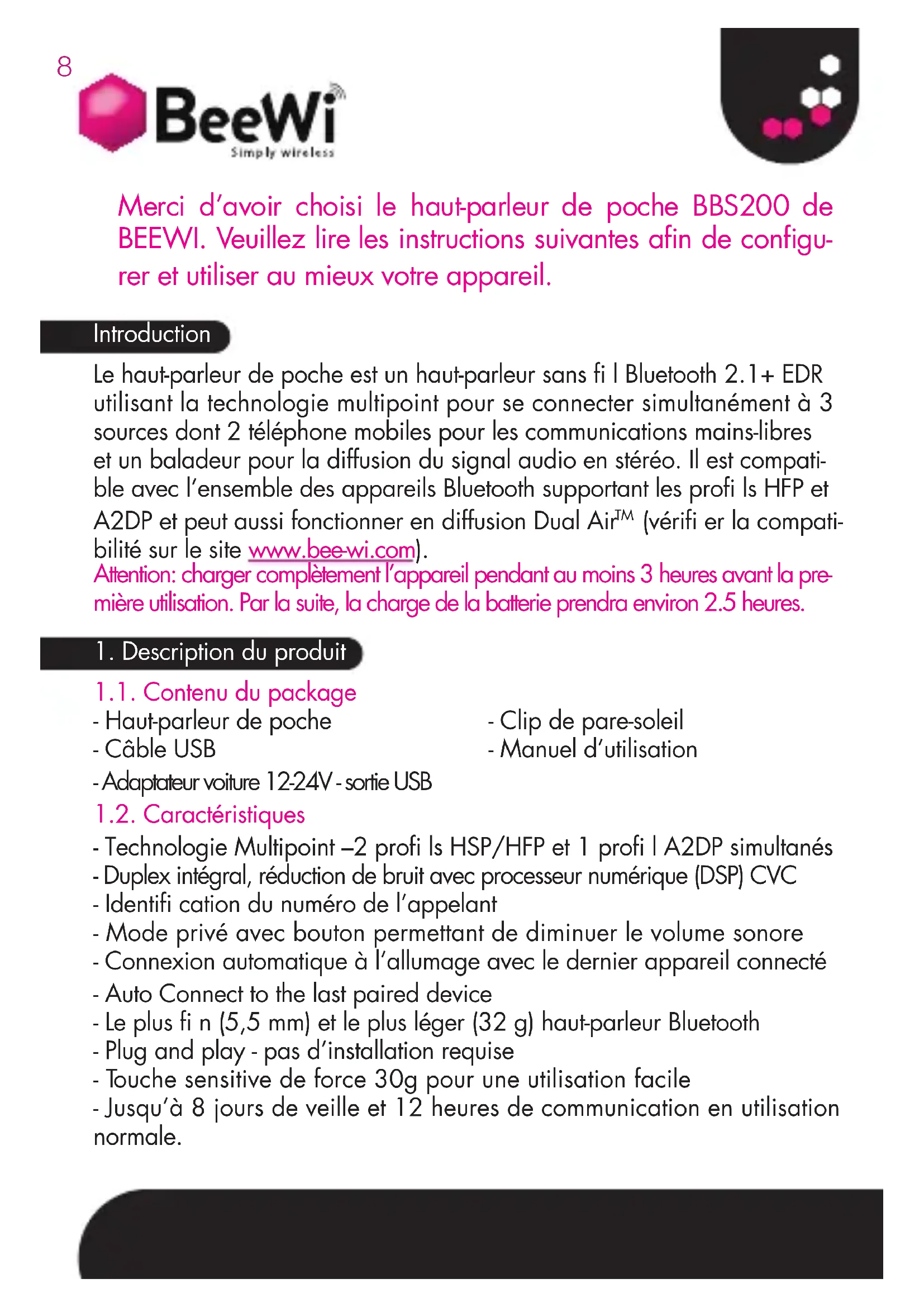 (vérifi er la compati- bilité sur le site www.bee-wi.com). Attention: charger complètement l’appareil pendant au moins 3 heures avant la pre- mière utilisation. Par la suite, la charge de la batterie prendra environ 2.5 heures. 1.3. Spécifi cations Spécifi cation Bluetooth Bluetooth V2.1+EDR Profi ls Bluetooth HSP - HFP1.5 - A2DP - AVRCP Bande de fréquence 2.4GHz~2.4835GHz Bande ISM Portée Classe 2, jusqu’à 10 mètres Autonomie en veille Jusqu’à 200 heures Autonomie en conversation Jusqu’à 12 heures Autonomie pour la musique Jusqu’à 10,3 heures Batterie 600mAH Li-Polymer Poids 32g 1.4. Présentation du produit VOL(-) / VOL(+) : contrôle du volume PRIVACY : coupure haut-parleur MIC : microphone CHARGING PORT : connecteur de charge PLAY/PAUSE/STOP : contrôle musique TALK : bouton multifonction 1.5. Indicateurs d’état Status DEL Description Mise en marche Rouge & Bleue Clignotent 3 fois simultanément Extinction Rouge & Bleue S’allument et s’éteignent simultanément Couplage Bleue Clignote rapidement Veille Bleue Clignote toutes les 5 secondes En communication Bleue Clignote 3 fois toutes les 4 secondes 1.1. Contenu du package - Haut-parleur de poche - Câble USB - Adaptateur voiture 12-24V - sortie USB - Clip de pare-soleil - Manuel d’utilisation 1.2. Caractéristiques - Technologie Multipoint –2 profi ls HSP/HFP et 1 profi l A2DP simultanés - Duplex intégral, réduction de bruit avec processeur numérique (DSP) CVC - Identifi cation du numéro de l’appelant - Mode privé avec bouton permettant de diminuer le volume sonore - Connexion automatique à l’allumage avec le dernier appareil connecté - Auto Connect to the last paired device - Le plus fi n (5,5 mm) et le plus léger (32 g) haut-parleur Bluetooth - Plug and play - pas d’installation requise - Touche sensitive de force 30g pour une utilisation facile - Jusqu’à 8 jours de veille et 12 heures de communication en utilisation normale. Introduction Merci d’avoir choisi le haut-parleur de poche BBS200 de BEEWI. Veuillez lire les instructions suivantes afi n de confi gu- rer et utiliser au mieux votre appareil. FRANCAIS
