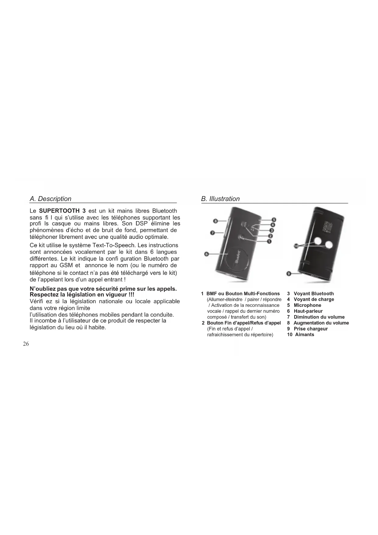 Le SUPERTOOTH 3 est un kit mains libres Bluetooth sans fi I qui s'utilise avec les téléphones supportant les profi Is casque ou mains libres. Son DSP élimine les phénomènes d'écho et de bruit de fond, permettant de téléphoner librement avec une qualité audio optimale.