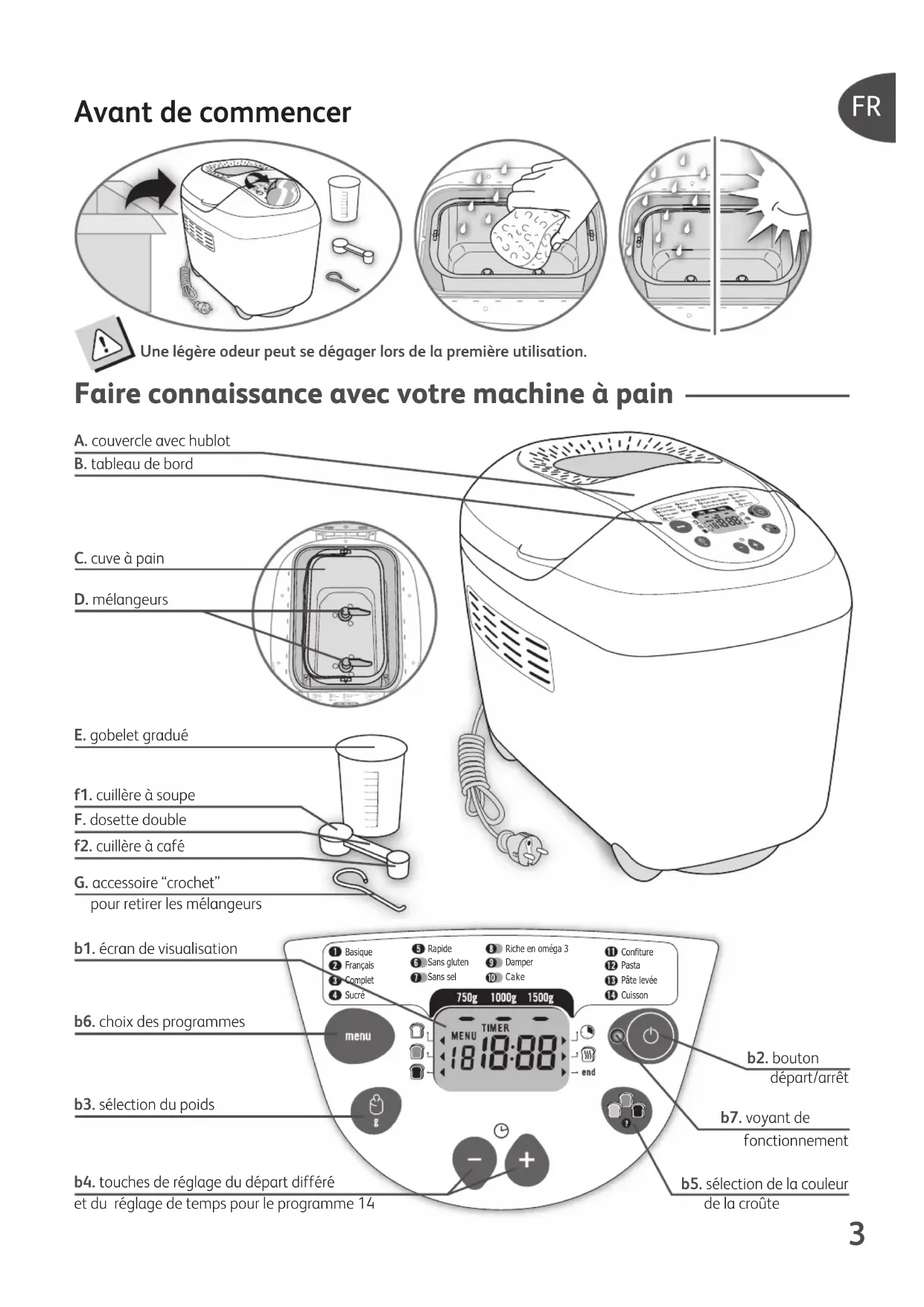 HOME BREAD TEFAL-OW5000-NC00017447_TEFAL-OW5000-NC00017447 26/07/10 10:15 Page1BasiqueFrançaisCompletRapideSans glutenSans selRiche en oméga 3Damper Cake SucréConfiturePastaPâte levéeCuisson Avant de commencer Bas iqueFran çai sCom pletRap ideSan s gl utenSan s se lRic he e n om éga 3Dam perCak eSCon fitu rePast aPât e le véeC Une légère odeur peut se dégager lors de la première utilisation. Faire connaissance avec votre machine à pain A. couvercle avec hublot B. tableau de bord f2. cuillère à café b1. écran de visualisation b2. bouton départ/arrêt b7. voyant de fonctionnement b5. sélection de la couleur de la croûte F. dosette double f1. cuillère à soupe C. cuve à pain G. accessoire “crochet” pour retirer les mélangeurs E. gobelet gradué b6. choix des programmes b3. sélection du poids b4. touches de réglage du départ différé et du réglage de temps pour le programme 14 D. mélangeurs