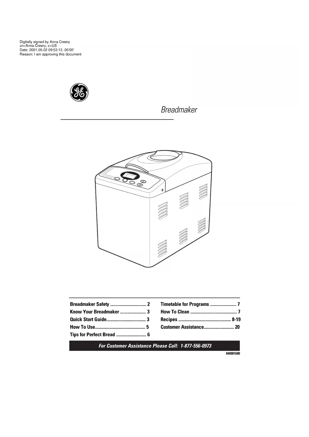 106732 - Machine à pain GE - Notice d'utilisation et mode d'emploi gratuit