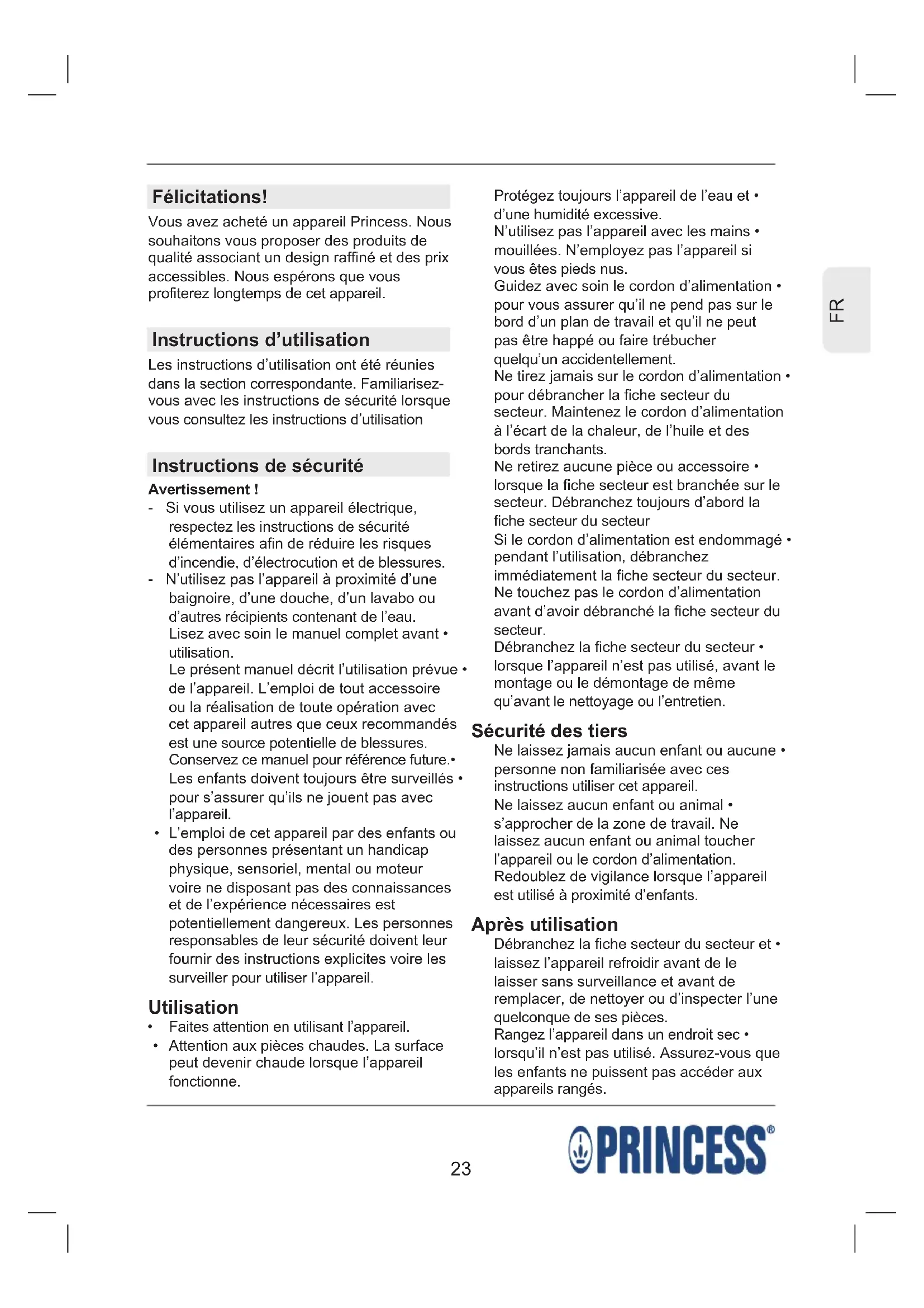 Protégez toujours l’appareil de l’eau et • d’une humidité excessive. N’utilisez pas l’appareil avec les mains • mouillées. N’employez pas l’appareil si vous êtes pieds nus. Guidez avec soin le cordon d’alimentation • pour vous assurer qu’il ne pend pas sur le bord d’un plan de travail et qu’il ne peut pas être happé ou faire trébucher quelqu’un accidentellement. Ne tirez jamais sur le cordon d’alimentation • pour débrancher la fiche secteur du secteur. Maintenez le cordon d’alimentation à l’écart de la chaleur, de l’huile et des bords tranchants. Ne retirez aucune pièce ou accessoire • lorsque la fiche secteur est branchée sur le secteur. Débranchez toujours d’abord la fiche secteur du secteur Si le cordon d’alimentation est endommagé • pendant l’utilisation, débranchez immédiatement la fiche secteur du secteur. Ne touchez pas le cordon d’alimentation avant d’avoir débranché la fiche secteur du secteur. Débranchez la fiche secteur du secteur • lorsque l’appareil n’est pas utilisé, avant le montage ou le démontage de même qu’avant le nettoyage ou l’entretien. Sécurité des tiers Ne laissez jamais aucun enfant ou aucune • personne non familiarisée avec ces instructions utiliser cet appareil. Ne laissez aucun enfant ou animal • s’approcher de la zone de travail. Ne laissez aucun enfant ou animal toucher l’appareil ou le cordon d’alimentation. Redoublez de vigilance lorsque l’appareil est utilisé à proximité d’enfants. Après utilisation Débranchez la fiche secteur du secteur et • laissez l’appareil refroidir avant de le laisser sans surveillance et avant de remplacer, de nettoyer ou d’inspecter l’une quelconque de ses pièces. Rangez l’appareil dans un endroit sec • lorsqu’il n’est pas utilisé. Assurez-vous que les enfants ne puissent pas accéder aux appareils rangés. Félicitations! Vous avez acheté un appareil Princess. Nous souhaitons vous proposer des produits de qualité associant un design raffiné et des prix accessibles. Nous espérons que vous profiterez longtemps de cet appareil. Instructions d’utilisation Les instructions d’utilisation ont été réunies dans la section correspondante. Familiarisez- vous avec les instructions de sécurité lorsque vous consultez les instructions d’utilisation Instructions de sécurité Avertissement ! - Si vous utilisez un appareil électrique, respectez les instructions de sécurité élémentaires afin de réduire les risques d’incendie, d’électrocution et de blessures. - N’utilisez pas l’appareil à proximité d’une baignoire, d’une douche, d’un lavabo ou d’autres récipients contenant de l’eau. Lisez avec soin le manuel complet avant • utilisation. Le présent manuel décrit l’utilisation prévue • de l’appareil. L’emploi de tout accessoire ou la réalisation de toute opération avec cet appareil autres que ceux recommandés est une source potentielle de blessures. Conservez ce manuel pour référence future.• Les enfants doivent toujours être surveillés • pour s’assurer qu’ils ne jouent pas avec l’appareil. L’emploi de cet appareil par des enfants ou • des personnes présentant un handicap physique, sensoriel, mental ou moteur voire ne disposant pas des connaissances et de l’expérience nécessaires est potentiellement dangereux. Les personnes responsables de leur sécurité doivent leur fournir des instructions explicites voire les surveiller pour utiliser l’appareil. Utilisation Faites attention en utilisant l’appareil.• Attention aux pièces chaudes. La surface • peut devenir chaude lorsque l’appareil fonctionne.24