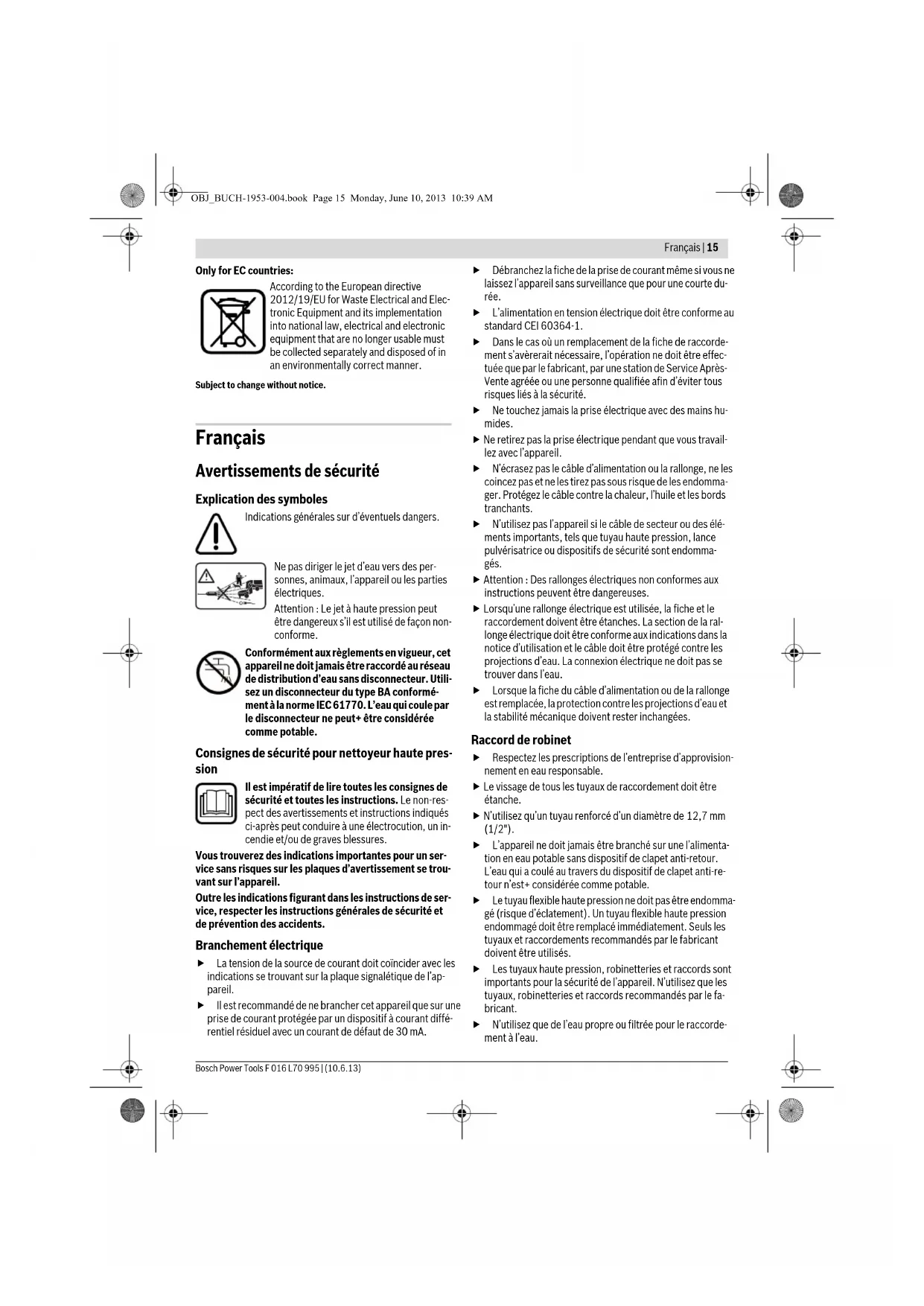 pour une longueur max. de 50 m Remarque : Au cas où une rallonge devrait être utilisée, celle- ci doit disposer, conformément à la description figurant dans les instructions de sécurité, d’un câble de protection de terre raccordé à la terre de l’installation électrique par l’intermé- diaire de la fiche. En cas de doute, consultez un électricien de formation ou le Service Après-Vente Bosch le+ proche. PRECAUTION : Des rallonges non conformes aux instructions peuvent être dangereuses. Les versions de câble de rallonge, fiche et ac- couplement doivent être étanches à l’eau et autorisées pour l’extérieur. Les connexions de câble doivent être sèches et ne pas repo- ser sur le sol. Pour+ de sécurité, utilisez un disjoncteur différentiel avec un courant de défaut de 30 mA maximum. Avant chaque utilisa- tion de la machine, contrôler ce disjoncteur différentiel. Si le câble d’alimentation est endommagé, il ne doit être répa- ré que dans un atelier agréé Bosch. Remarque concernant les produits non commercialisés en GB : ATTENTION :Pour votre propre sécurité, il est nécessaire que la fiche montée sur la machine soit raccordée à la ral- longe. Le dispositif de couplage de la rallonge doit être proté- gé des projections d’eau, être en caoutchouc ou être recou- vert de caoutchouc. La rallonge doit être utilisée avec un serre-câble. Faites attention à ce que cet appareil ne soit jamais mis en marche sans eau. Fonctionnement Mise en marche Raccorder le tuyau d’eau (non fourni) sur le raccord de robi- net et l’appareil. 3 600 ... HA7 1.. HA7 2.. Nous déclarons sous notre propre responsabilité que le produit décrit sous « Caractéristiques Techniques » est en conformité avec les normes ou documents norma- tifs suivants : EN 60335 conformément aux termes des réglementations en vigueur 2011/65/UE, 2004/108/CE, 2006/42/CE, 2000/14/CE. 2000/14/CE : Niveau d’intensité acoustique garanti Procédures d’évaluation de la conformité conformément à l’annexe V. dB(A) 99 93 Henk Becker Executive Vice President Engineering Helmut Heinzelmann Head of Product Certification PT/ETM9 Opération Figure Accessoires fournis 1 Rabattre la poignée vers le bas. 2 Raccordement de la lance sur la lance pulvérisatrice 3 Raccordement du tuyau haute pression/de la lance pulvérisatrice 4 Montage de la buse 5 Raccord de robinet 6 Mise en marche/arrêt 7 Ajuster le jet 8 Connecter la bouteille de détergent 9 Nettoyer le filtre 10 Nettoyer la buse 11 Stockage du pistolet 12 Stockage du pistolet / de la lance / de la buse pen- dant l’utilisation 13 Introduire la pointe de centrage dans la fixation. 14 Stockage 15 Sélection des accessoires 16 OBJ_BUCH-1953-004.book Page 18 Monday, June 10, 2013 10:39 AMFrançais | 19 Bosch Power Tools F 016 L70 995 | (10.6.13) Veillez à ce que l’interrupteur se trouve dans la position « 0 » et branchez l’appareil sur la prise. Ouvrez le robinet. Actionnez le verrouillage de mise en fonctionnement (inter- rupteur arrière sur la poignée de la lance) pour débloquer la gâchette. Appuyez à fond sur la gâchette jusqu’à ce que l’eau coule de manière régulière et qu’il n’y ait+ d’air dans l’appareil et dans le tuyau haute pression. Lâchez la gâchette. Actionnez le verrouillage de mise en fonctionnement (interrupteur avant sur la poignée de la lance). Tournez l’interrupteur principal. Dirigez la lance pulvérisatrice vers le bas. Actionnez le verrouillage de mise en fonctionnement afin de déverrouiller la gâchette. Appuyez à fond sur la gâchette. Fonction autostop (arrêt automatique) L’appareil arrête le moteur dès que la gâchette sur la poignée de la lance est relâchée. Instructions d’utilisation Généralités Assurez-vous que le nettoyeur haute pression se trouve sur une surface plane. Ne vous éloignez pas trop avec le tuyau flexible haute pression et ne tirez pas le nettoyeur haute pression par le tuyau. Cela pourrait faire perdre l’équilibre au nettoyeur haute pression qui risque de basculer. Ne pliez pas le tuyau flexible haute pression et ne passez pas dessus avec un véhicule. Protégez le tuyau flexible haute pression de bords et de coins tranchants. N’utilisez pas la buse à jet rotatif pour laver votre voiture. Avertissement ! Le Patio Cleaners n’est conçu que pour une utilisation sur des surfaces planes ! Ne l’utilisez pas pour les escaliers et sur des surfaces verticales. Ne touchez jamais la buse de rotation quand elle est mise en marche ! Instructions d’utilisation pour le travail avec détergents N’utilisez que des détergents explicitement appropriés aux nettoyeurs haute pression. Nous recommandons d’utiliser aussi peu de détergent que possible afin de ménager l’environnement. Respecter les re- commandations de dilution figurant sur le réservoir. Méthode de nettoyage recommandée 1ère étape : Détacher les salissures Enlevez le dispositif de réglage de la buse 3 en 1 et dosez avec parcimonie le produit de nettoyage. 2e étape : enlever l’encrassement Enlevez l’encrassement ramolli au jet haute pression. Note : Pour nettoyer des surfaces verticales, commencez avec la saleté/le détergent par le bas et continuez peu à peu vers le haut. Lors du rinçage, travaillez de haut en bas. Dépistage d’erreurs Problème Cause possible Remède Le moteur ne démarre pas La fiche n’est pas branchée Brancher la fiche Prise de courant défectueuse Utiliser une autre prise Le fusible a sauté Remplacer le fusible Rallonge endommagée Essayer sans rallonge Le dispositif de protection de surcharge est déclenché Laissez refroidir le moteur pendant 15 min Gelé Laisser dégeler la pompe, le tuyau d’eau ou les accessoires Le moteur s’arrête Le fusible a sauté Remplacer le fusible Mauvaise tension du secteur Contrôler la tension du secteur, elle doit correspondre à l’indication figurant sur la plaque signalétique Le dispositif de