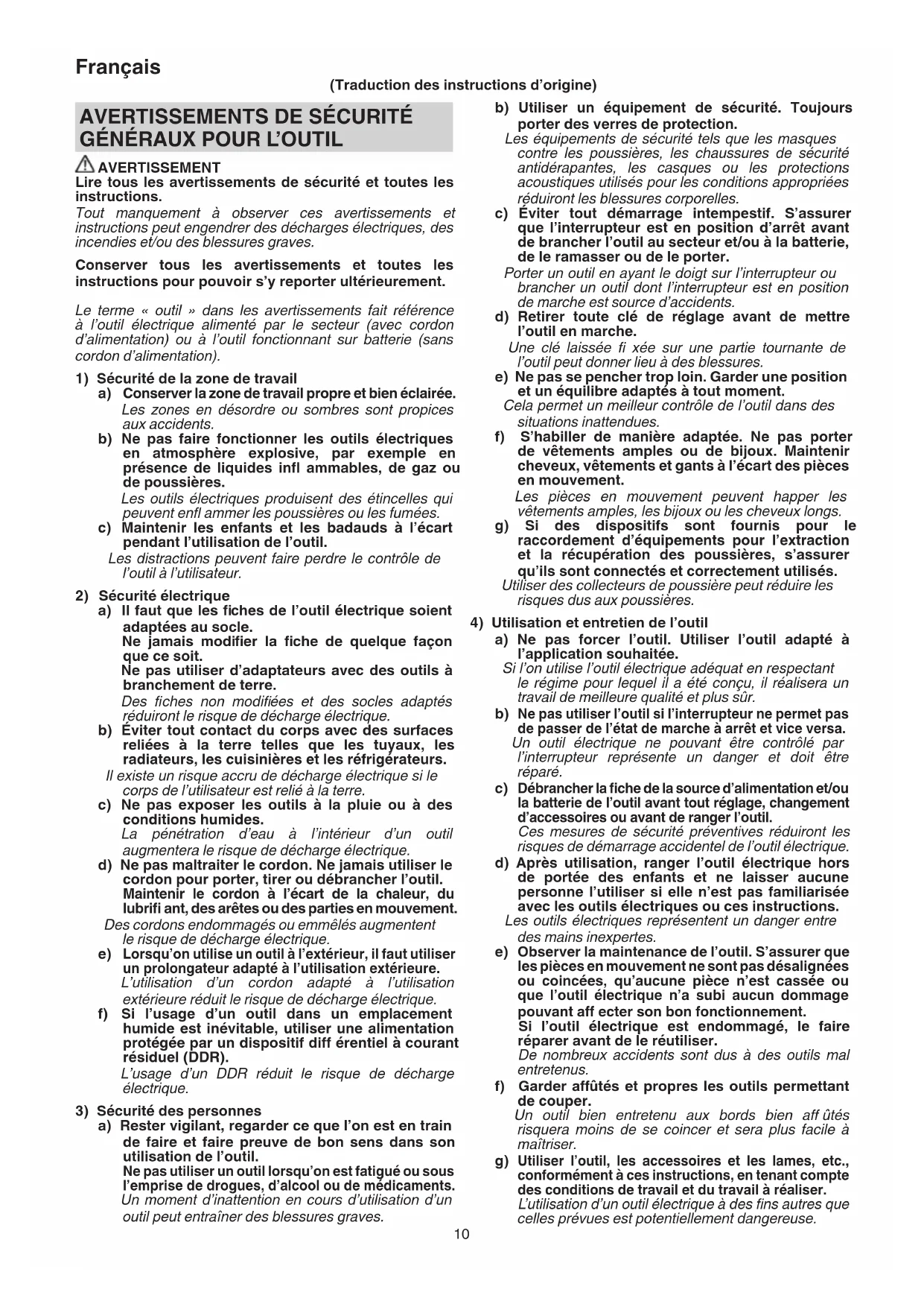 AVERTISSEMENT Lire tous les avertissements de sécurité et toutes les instructions. Tout manquement à observer ces avertissements et instructions peut engendrer des décharges électriques, des incendies et/ou des blessures graves. Conserver tous les avertissements et toutes les instructions pour pouvoir s’y reporter ultérieurement. Le terme « outil » dans les avertissements fait référence à l’outil électrique alimenté par le secteur (avec cordon d’alimentation) ou à l’outil fonctionnant sur batterie (sans cordon d’alimentation).