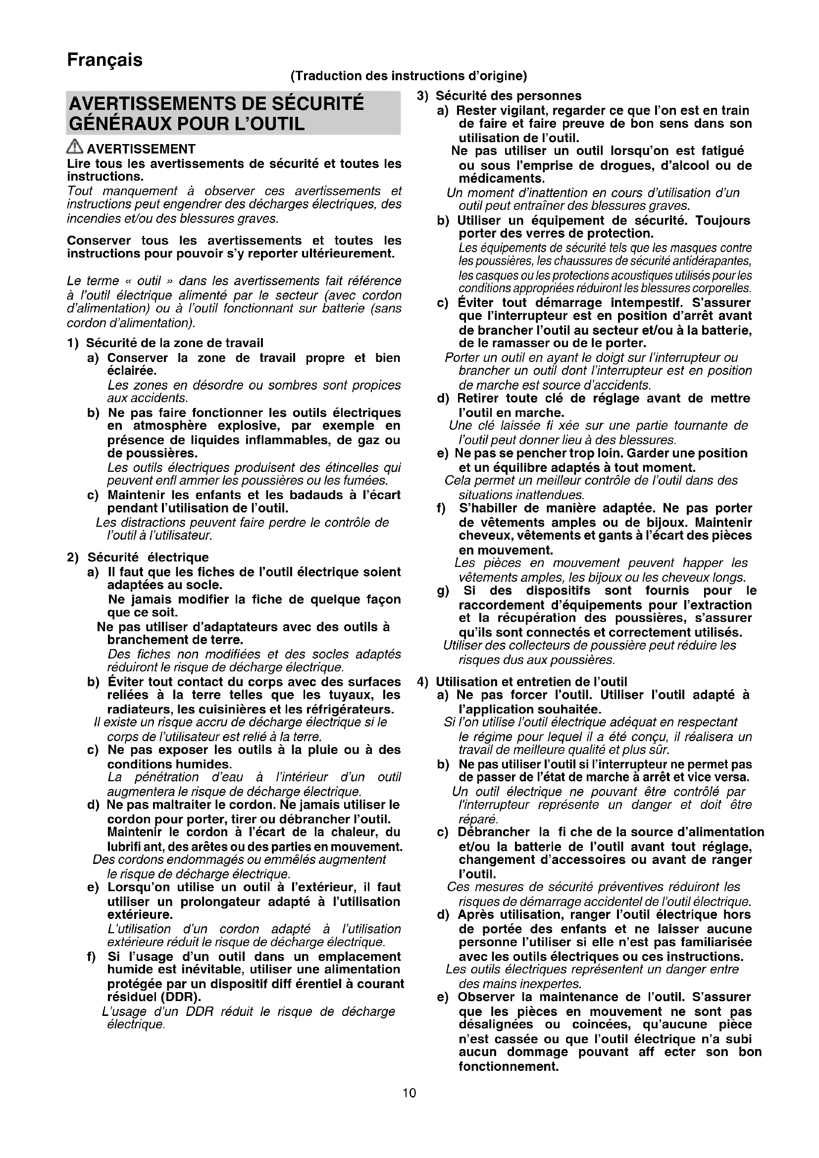 AVERTISSEMENT Lire tous les avertissements de sécurité et toutes les instructions. Tout manquement à observer ces avertissements et instructions peut engendrer des décharges électriques, des incendies et/ou des blessures graves. Conserver tous les avertissements et toutes les instructions pour pouvoir s’y reporter ultérieurement. Le terme « outil » dans les avertissements fait référence à l’outil électrique alimenté par le secteur (avec cordon d’alimentation) ou à l’outil fonctionnant sur batterie (sans cordon d’alimentation).