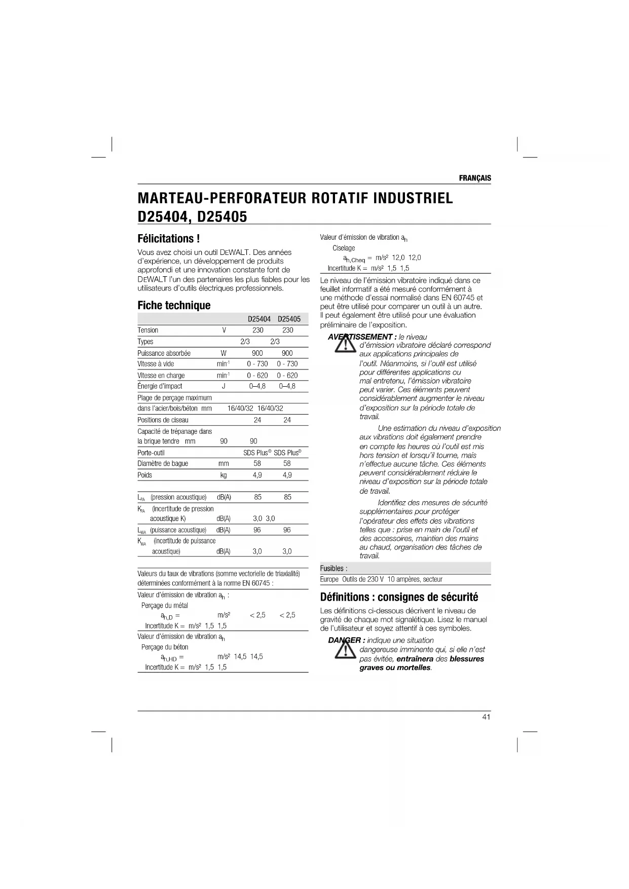situation dangereuse potentielle qui, si elle n’est pas évitée, pourrait entraîner des blessures graves ou mortelles. ATTENTION : indique une situation dangereuse potentielle qui, si elle n’est pas évitée, pourrait entraîner des blessures minimes ou modérées. AVIS : indique une pratique ne posant aucun risque de dommages corporels mais qui par contre, si rien n’est fait pour l’éviter, pourrait poser des risques de dommages matériels. Indique un risque d’électrocution. Indique un risque d’incendie. Déclaration de conformité CE DIRECTIVES MACHINES D25404, D25405 DEWALT certifie que les produits décrits dans le paragraphe « Fiche technique » sont conformes aux normes : 98/37/EC (jusqu’au 28 Déc. 2009), 2006/42/EC (à partir du 29 Déc. 2009), EN 60745-1, EN 60745-2-1, EN 60745-2-2. Ces produits sont également conformes aux normes 2004/108/EC. Pour plus d’informations, veuillez contacter DEWALT à l’adresse suivante ou vous reporter au dos de cette notice d’instructions. Le soussigné est responsable de la compilation du fichier technique et fait cette déclaration au nom de DEWALT. Horst Grossmann Vice-président de l’ingénierie et du développement des produits DEWALT, Richard-Klinger-Strase 11, D-65510, Idstein, Allemagne