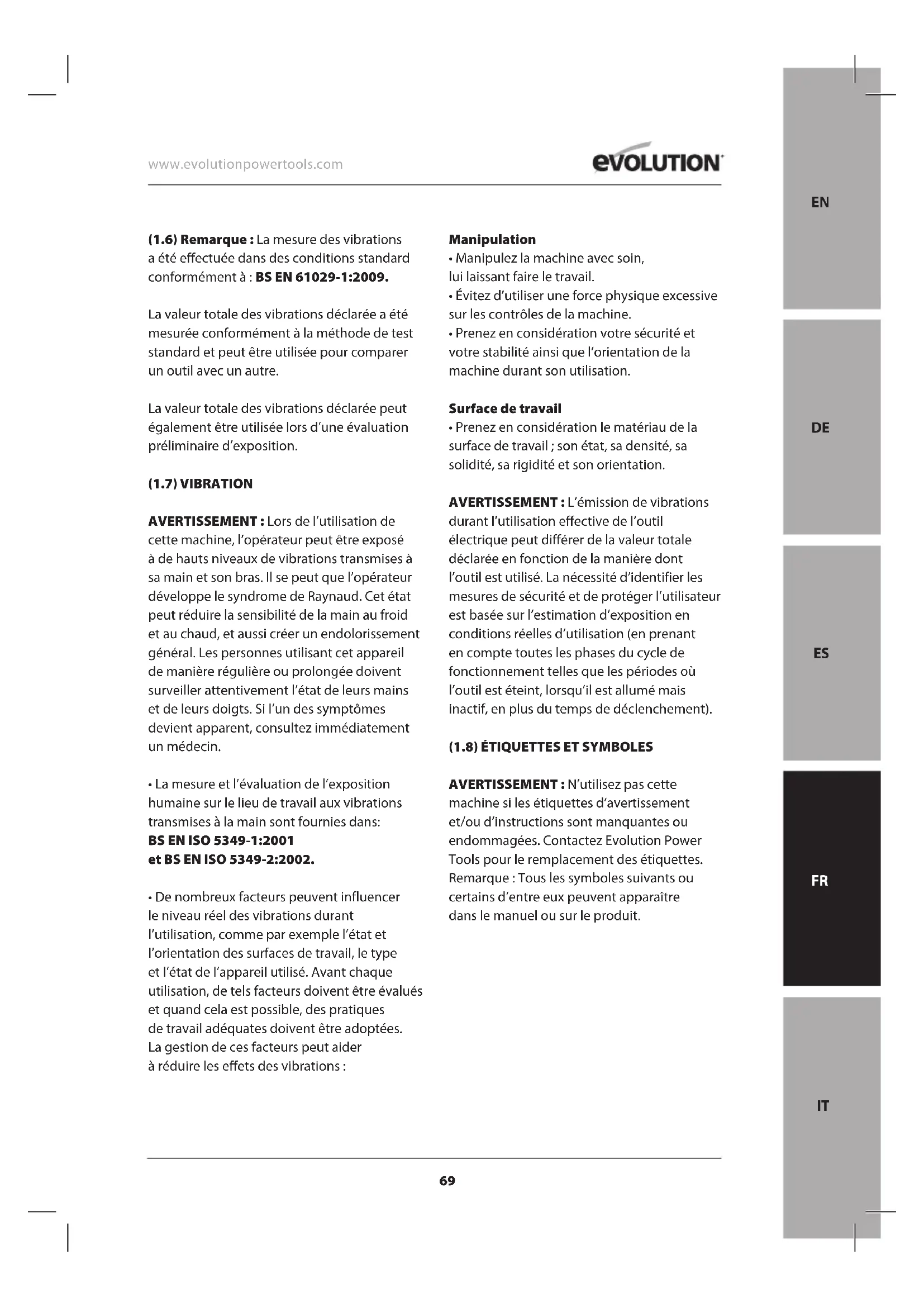 FRANÇAIS Traduction D’original66 www.evolutionpowertools.com SOMMAIRE INTRODUCTION Garantie Page 67 Particularités de la machine Page 68 Étiquettes et symboles Page 69 Vibration Page 69 Usage prévu de cet outil électrique Page 70 Usage proscrit de cet outil électrique Page 70