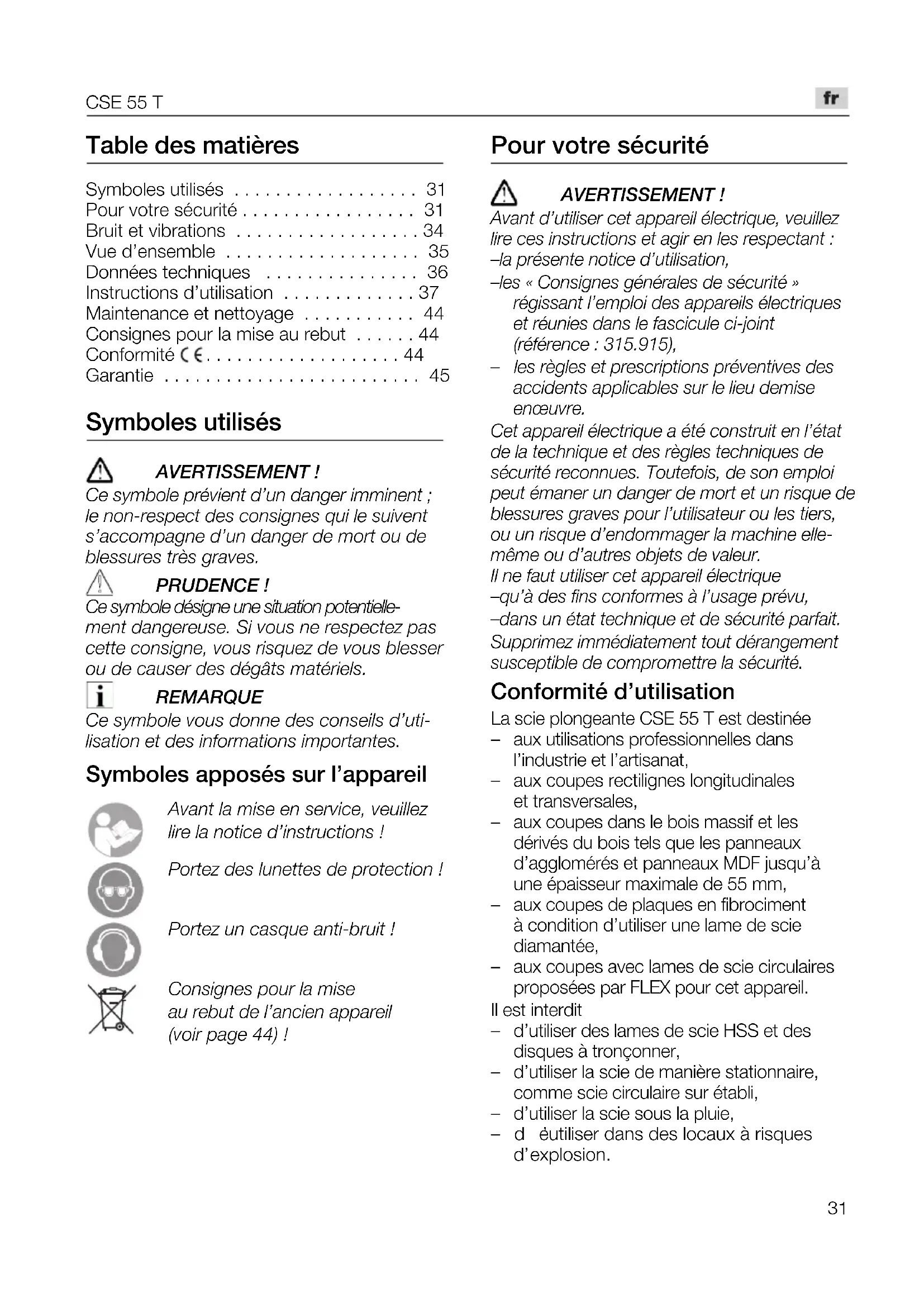 Garantie FLEX consent 2 années de garantie fabricant à l’achat d’une machine neuve. La période de garantie commence à la date de vente de la machine au consommateur final. La garantie ne couvre que les défauts imputables à des vices de matière et / ou de fabrication ainsi qu’à l’absence de propriétés promises. En cas de recours en garantie, munissez-vous de la preuve d’achat originale comportant la date d’achat. Les réparations sous garantie ne pourront être réalisées que par des ateliers agréés par FLEX ou par des stations de service après-vente. La garantie n’est valide que si la machine a été utilisée de manière conforme. Ne sont pas couverts par la garantie notamment l’usure conditionnée par l’utilisation, les applications inexpertes, les machines qui ont été démontées intégralement ou en partie, ainsi que les dégâts imputables à une surcharge de la machine, l’utilisation d’outils non homologués, défectueux ou ne correspondant pas à l’utilisation prévue. Sont également exclus les dommages occasionnés par la machine sur l’outil utilisé, sur la pièce, l’emploi de la force, les dommages consécutifs imputables à une maintenance inexperte ou insuffisante de la part du client ou de tiers, les dommages provoqués par une intervention tierce ou des corps étrangers tels que le sable ou des pierres, ainsi que les dommages provoqués par le non-respect du contenu de la notice (par ex. le raccordement à une tension secteur ou à un type de courant erroné(e)). Les recours en garantie concernant les outils et / ou accessoires ne seront valides que si ces derniers ont fonctionné sur des machines prévues ou autorisées pour une telle utilisation. Exclusion de responsabilité Le fabricant et son représentant ne pourront être tenus responsables des dommages et du bénéfice perdu en raison d’une interruption du fonctionnement de l’affaire, provoqués par le produit ou par l’impossibilité de l’utiliser. Le fabricant et son représentant ne pourront être tenus responsables des dommages provoqués par une utilisation inexperte du produit ou par son utilisation en association avec les produits d’autres fabricants.CSE 55 T